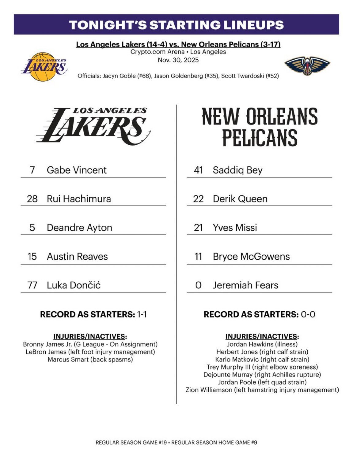 湖人首发:东契奇、里夫斯、文森特、八村塁、艾顿鹈鹕首发:费尔斯、麦戈文斯、贝、米