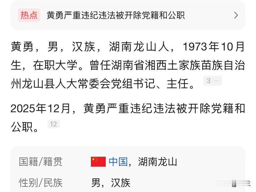 今天湖南龙山县的黄勇又上了热搜, 他是1973年出生的湖南龙山人, 他长期在龙山县工作, 先后当过不少重要职务, 几十年来他积累了丰富的工作经验, 就在去年他还在活动上侃侃而谈, 勉励大家要保持操守, 他现在52岁正是年富力强的时候, 本还可以放开手脚大干事业, 结果却还是上了热搜, 如今实在是令人唏嘘, 这也表明了, 做了不该做的事, 终究是要付出代价的!