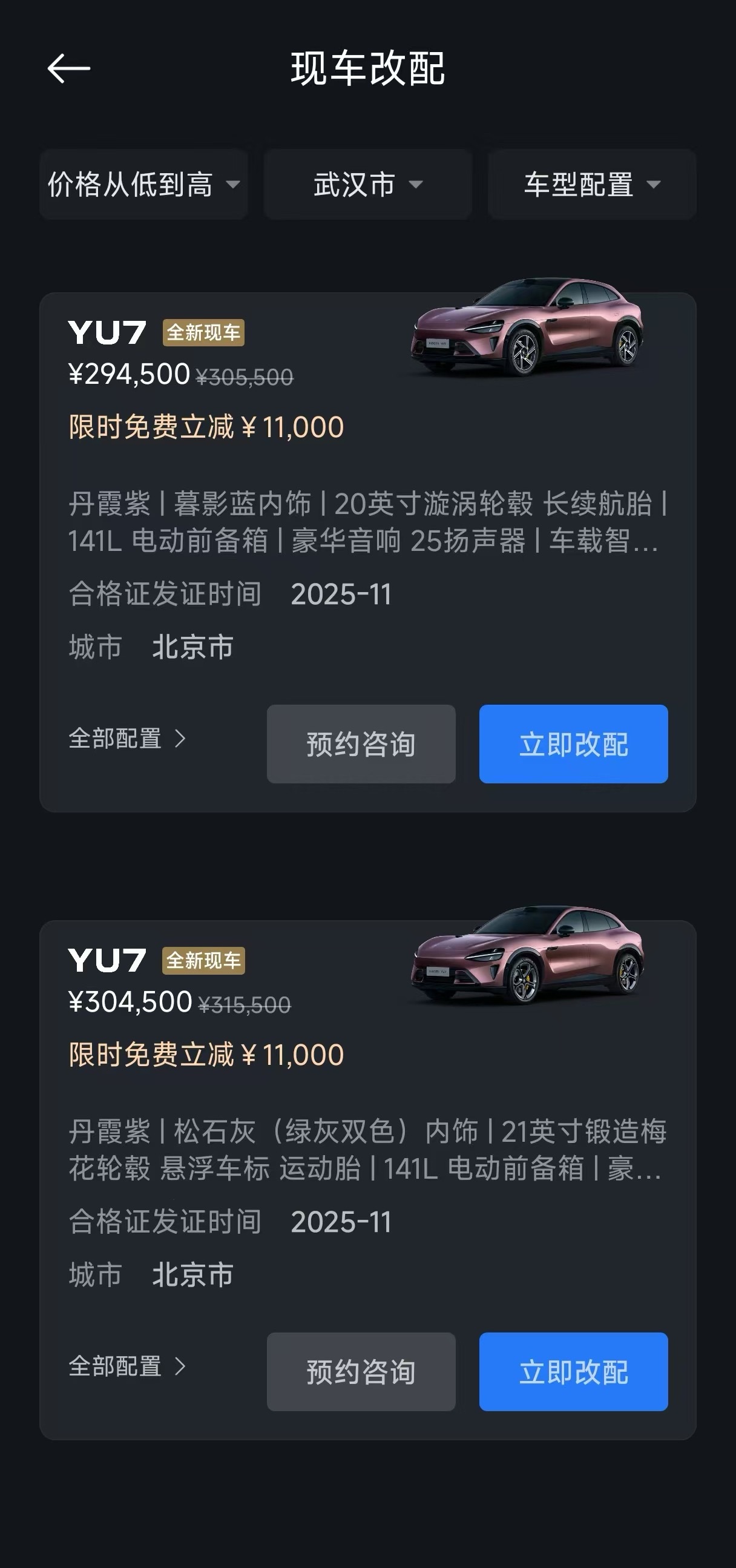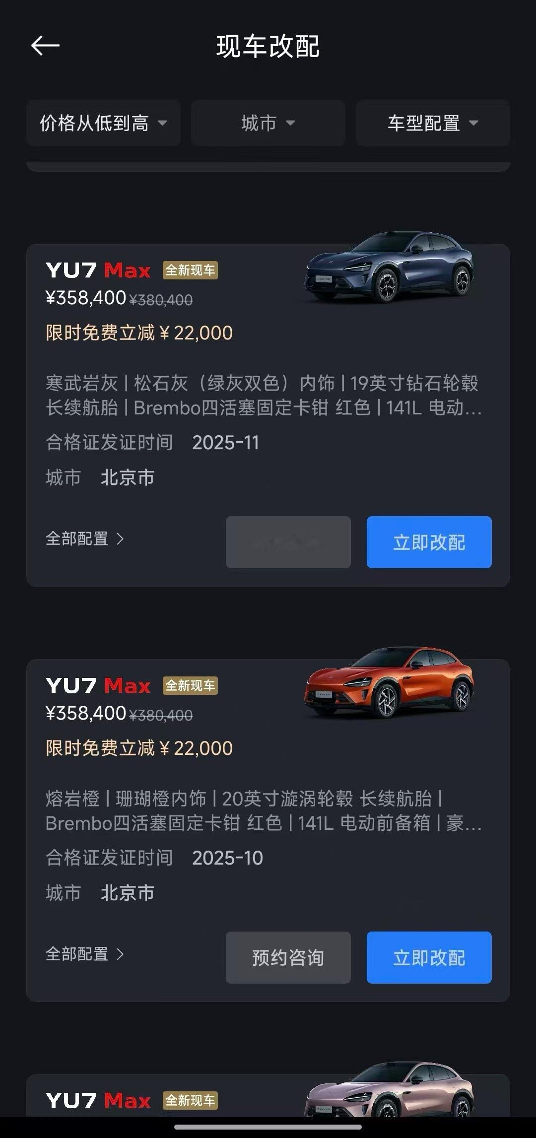 刚研究了一下小米YU7的现车比原价优惠了4000但是选了配置的都得加钱不过针对年