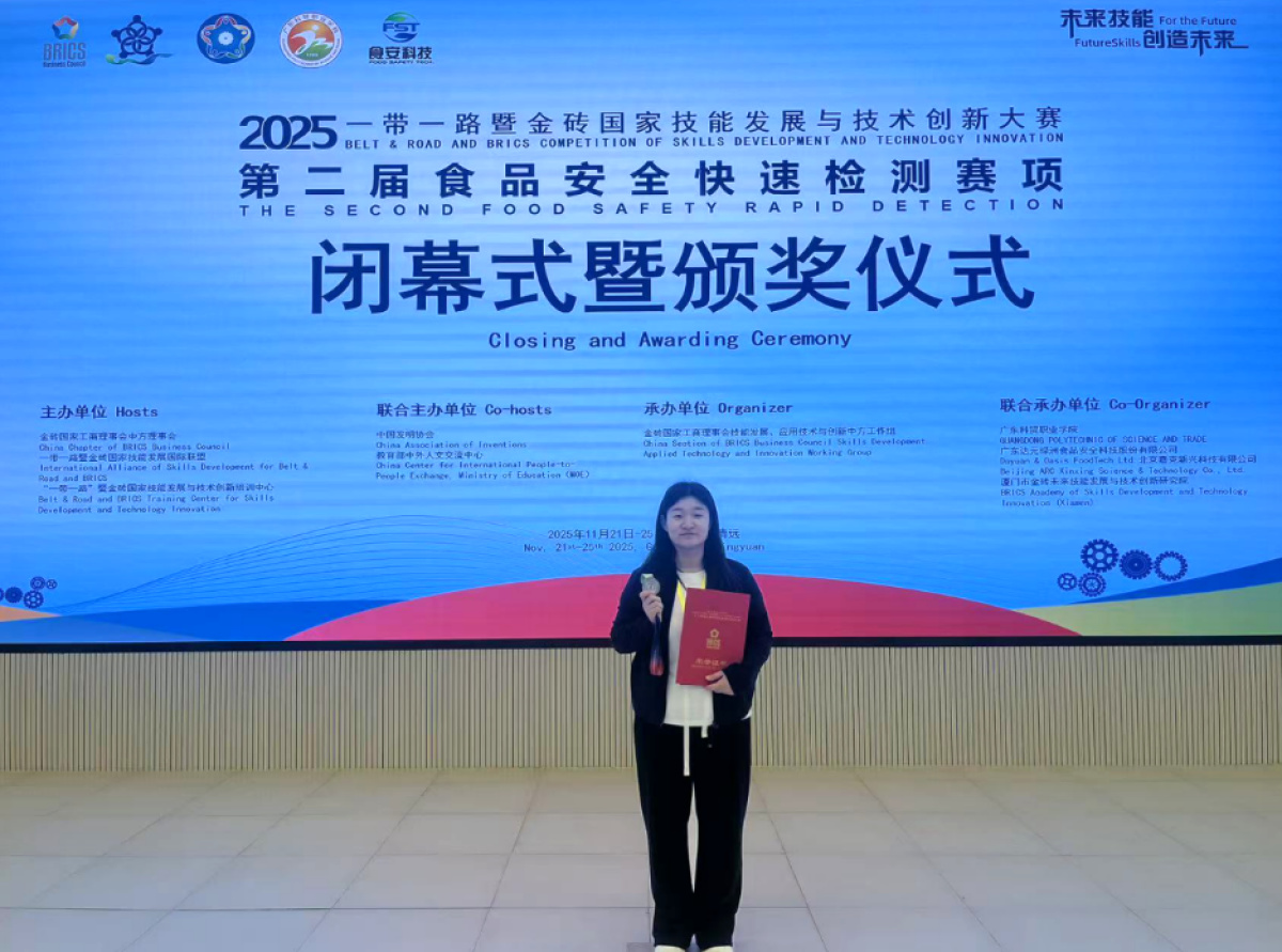 近日,2025“一带一路”暨金砖国家技能发展与技术创新大赛“食品安全快速检测赛项”全国总决赛在广东科贸职业学院落下帷幕。漯河医学高等专科学校(以下简称“漯河医专”)公共卫生与健康营养学院教师陈冲凭借扎实的专业知识和精湛的实践操作能力,在教师赛中脱颖而出,荣获二等奖,充分展现了学校在食品安全快速检测领域的教学实力与人才培养质量。