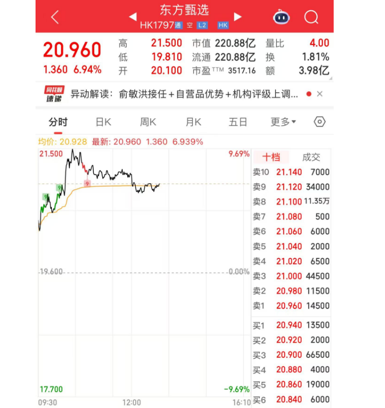 上证报中国证券网讯(记者李五强)12月1日,东方甄选股价走强,一度涨逾9%,截至13时44分,东方甄选股价报20.96港元/股,涨幅6.94%。