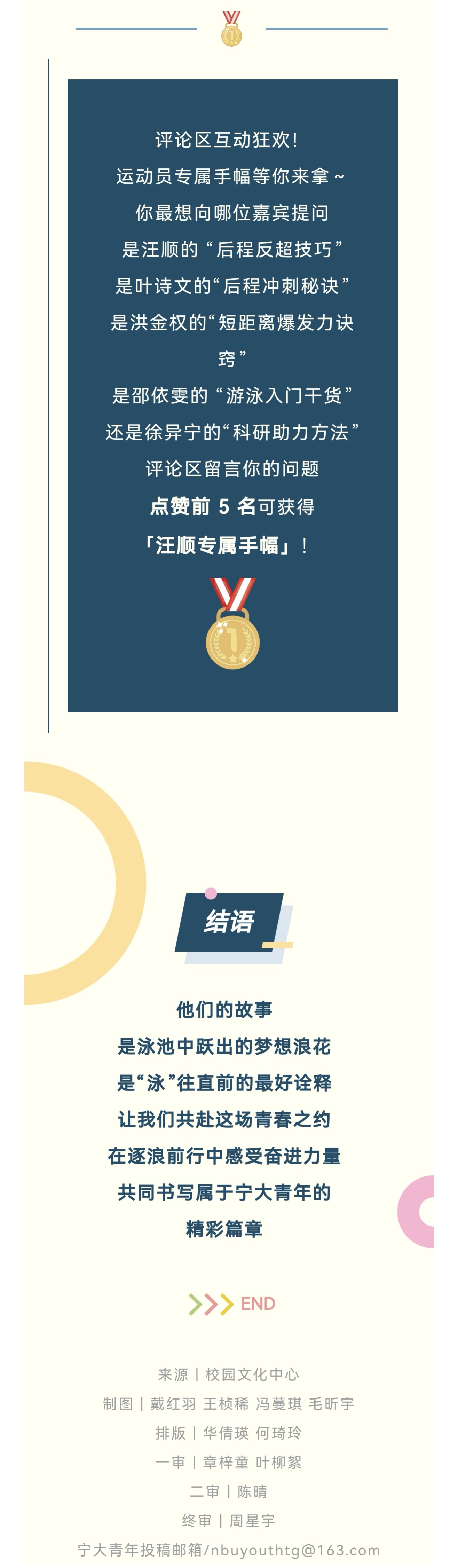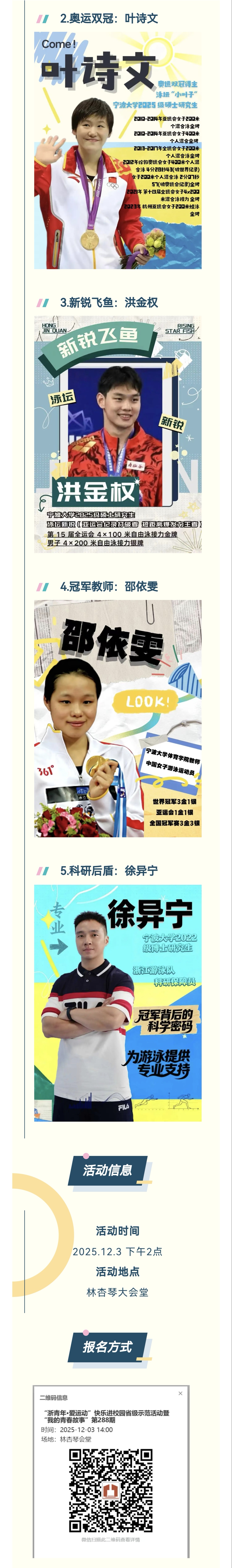 SWim进行时 『8574』20251201 宁波大学讲座预告“泳”往直前,青春逐浪——泳坛闯将的青春故事震撼来袭!讲述小顺头泳不言弃的青春故事~⌚活动时间:2025年12月3日14:00📫活动地点:林杏琴大会堂(校内讲座)cr宁大青年