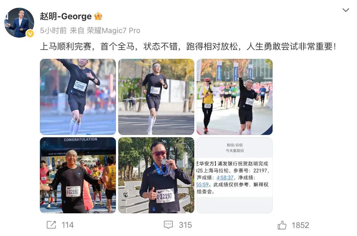 刚看到前荣耀CEO赵明发文,参加了上海马拉松全马比赛,精神状态良好。平台的小尾巴