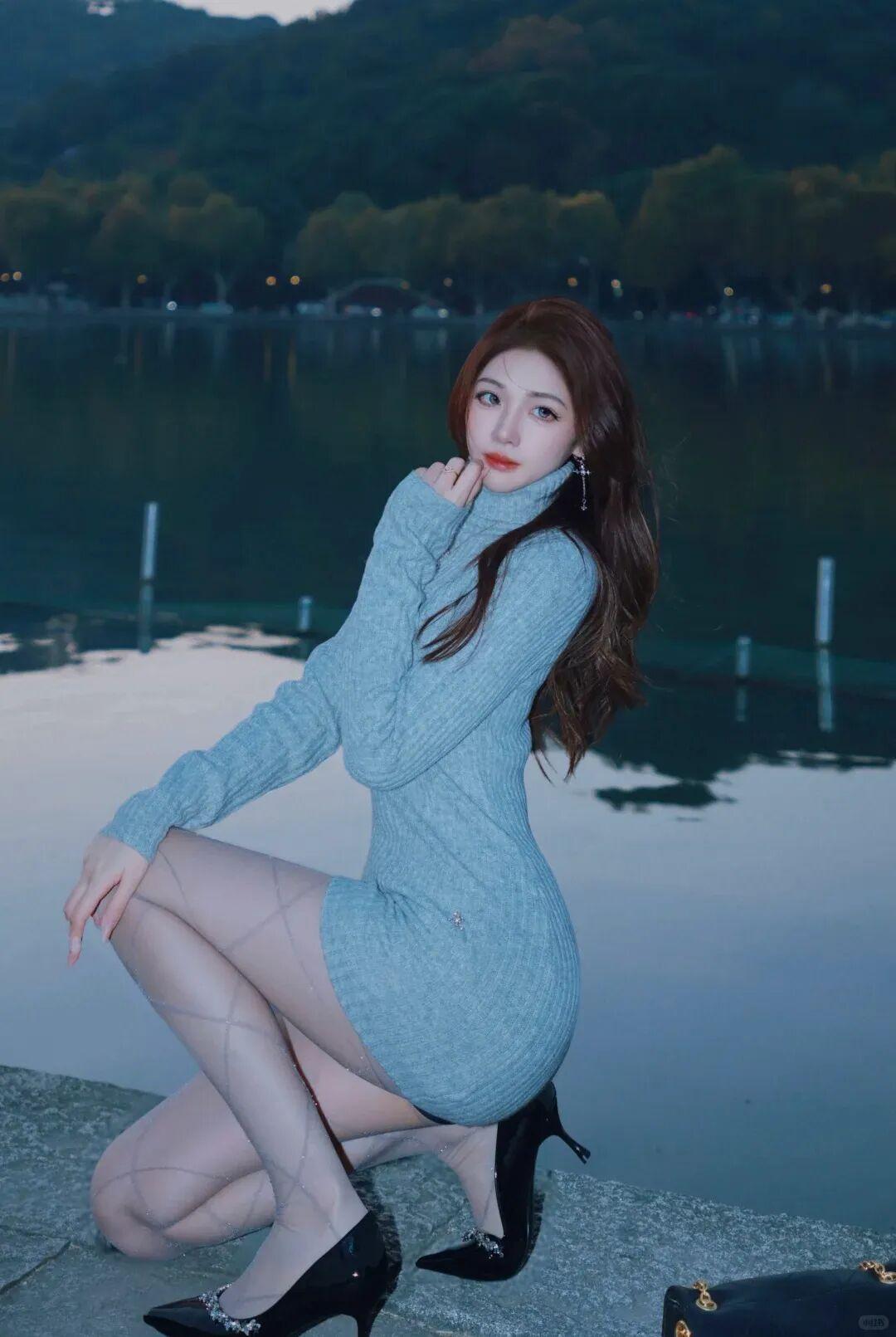 湖畔漫步,浅蓝色毛衣搭配网袜,优雅迷人!女生拥有一双长腿是什么感觉?