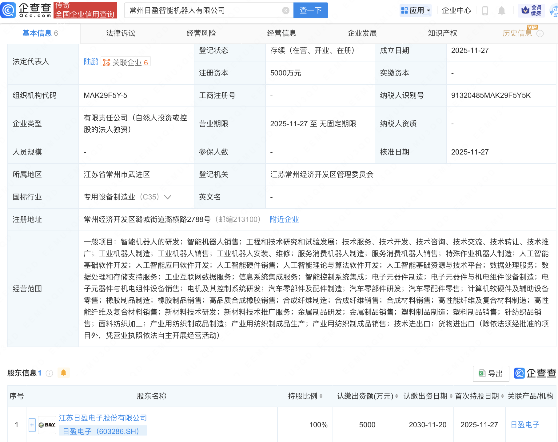 企查查APP显示,近日,常州日盈智能机器人有限公司成立,注册资本5000万元,经营范围包含:智能机器人的研发;智能机器人销售;人工智能硬件销售;人工智能理论与算法软件开发;人工智能基础资源与技术平台等。企查查股权穿透显示,该公司由日盈电子(603286)全资持股。