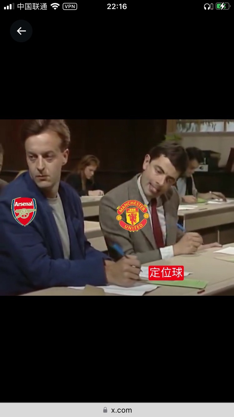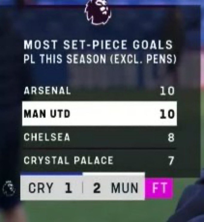 曼联利用定位球打进10个联赛进球,追平阿森纳。