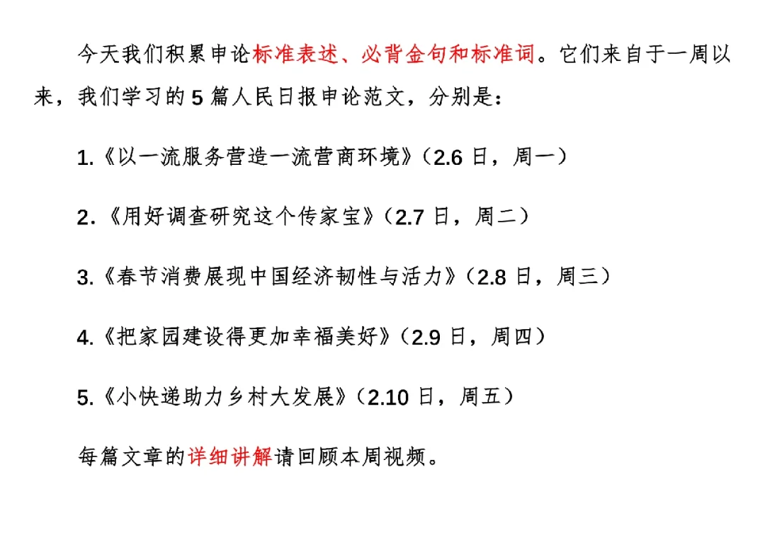 今天我们积累申论素材、必背金句和重点知识。它们来自于一周以来,我们学习的5篇人民日报申论范文,分别是: