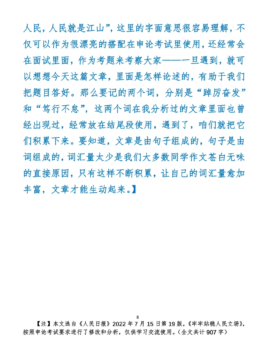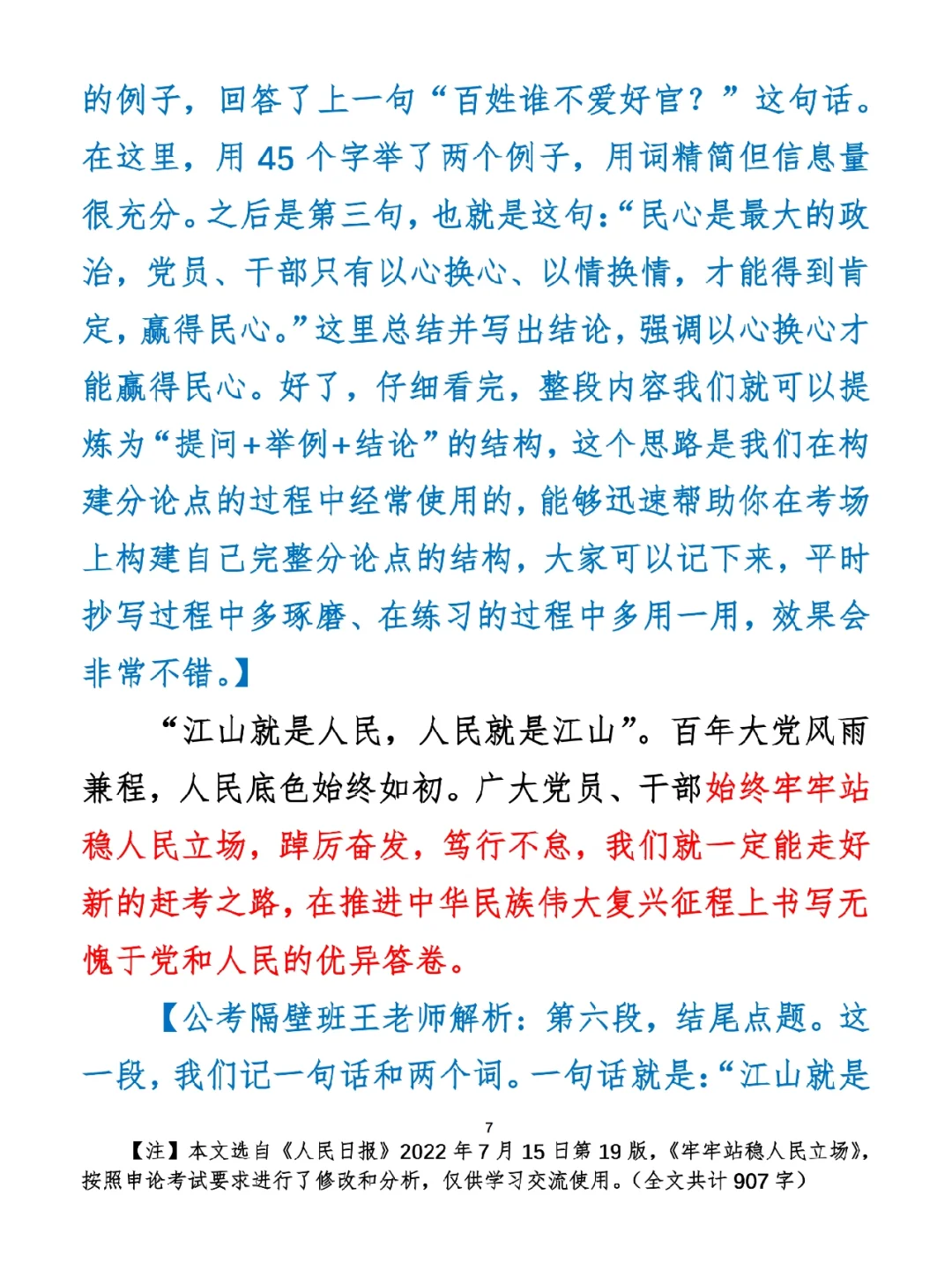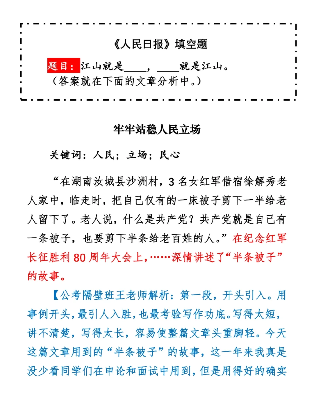 今日打卡作业: 1. 完成填空题 2. 抄写全文红字+划线部分内容 3. 写完后在留言区打卡 ⭐️ ⭐️ ⭐️ ⭐️ ⭐️ ⭐️ 如何抄写:每天的抄写文章以图片形式发在“公考隔壁班王老师”账号,红色字是重点句和结构句,黑色字是正文,蓝色字是解析,大家抄写时不必抄蓝色字。建议先通读全文(包括蓝色解析部分),做到心中有数再开始抄写,效果会更好。 关于文章:抄写文章来源于人民日报,但每篇文章我都根据申论考试要求进行了修改,主要集中在四个方面:一是重写或修改开头、结尾;二是统一段首句句式结构;三是调整段落字数,使文章结构更均衡;四是简化复杂长难句,使之更具可模仿性。每篇文章修改幅度不同,无论修改多少,都是基于申论考试要求,毫无对人民日报文章品评之意。(此处致敬人民日报) 关于解析:我会在文章每段后面加一段蓝色字的解析,是我自己在抄写时的感悟,篇幅时间有限,不能面面俱到,但求重点突出。如果你有其他感悟,也希望能在评论里分享,我们相互学习、共同进步。 ⭐️ ⭐️ ⭐️ ⭐️ ⭐️ ⭐️ 这里是公考隔壁班王老师独创的“每天半小时・申论80分”抄写团,欢迎加入我们!