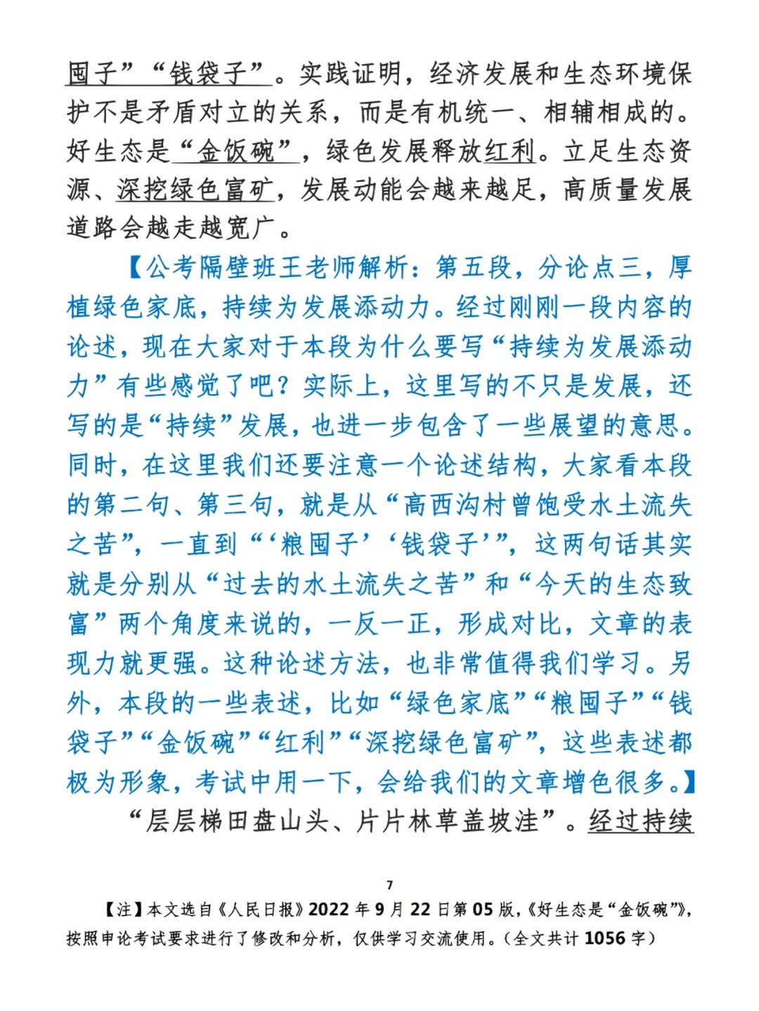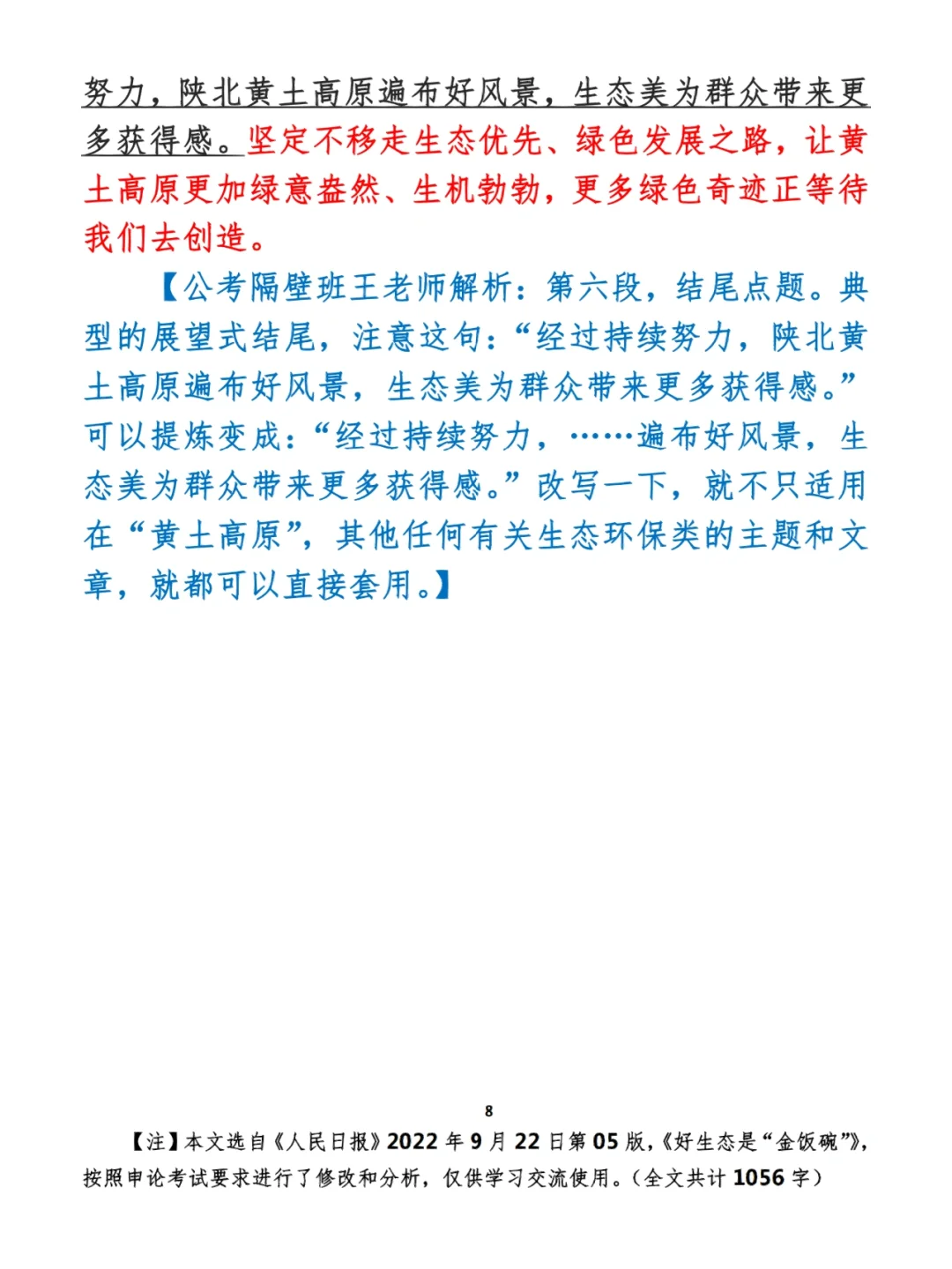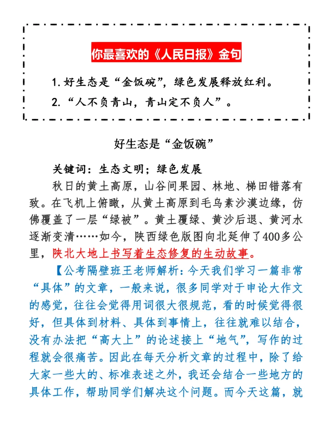 今日打卡作业: 1. 选一句你最喜欢的金句 2. 抄写全文红字+划线部分内容 3. 写完后在留言区打卡 ⭐️ ⭐️ ⭐️ ⭐️ ⭐️ ⭐️ 如何抄写:每天的抄写文章以图片形式发在“公考隔壁班王老师”账号,红色字是重点句和结构句,黑色字是正文,蓝色字是解析,大家抄写时不必抄蓝色字。建议先通读全文(包括蓝色解析部分),做到心中有数再开始抄写,效果会更好。 关于文章:抄写文章来源于人民日报,但每篇文章我都根据申论考试要求进行了修改,主要集中在四个方面:一是重写或修改开头、结尾;二是统一段首句句式结构;三是调整段落字数,使文章结构更均衡;四是简化复杂长难句,使之更具可模仿性。每篇文章修改幅度不同,无论修改多少,都是基于申论考试要求,毫无对人民日报文章品评之意。(此处致敬人民日报) 关于解析:我会在文章每段后面加一段蓝色字的解析,是我自己在抄写时的感悟,篇幅时间有限,不能面面俱到,但求重点突出。如果你有其他感悟,也希望能在评论里分享,我们相互学习、共同进步。 ⭐️ ⭐️ ⭐️ ⭐️ ⭐️ ⭐️ 这里是公考隔壁班王老师独创的“每天半小时・申论80分”抄写团,欢迎加入我们!