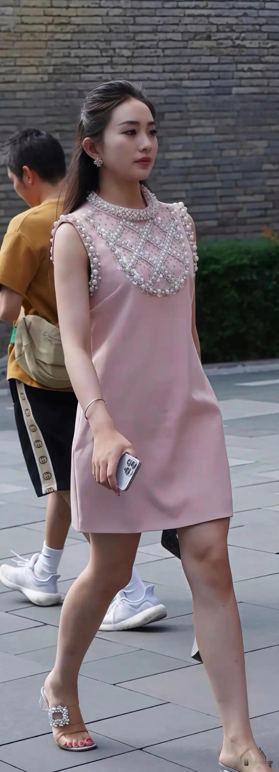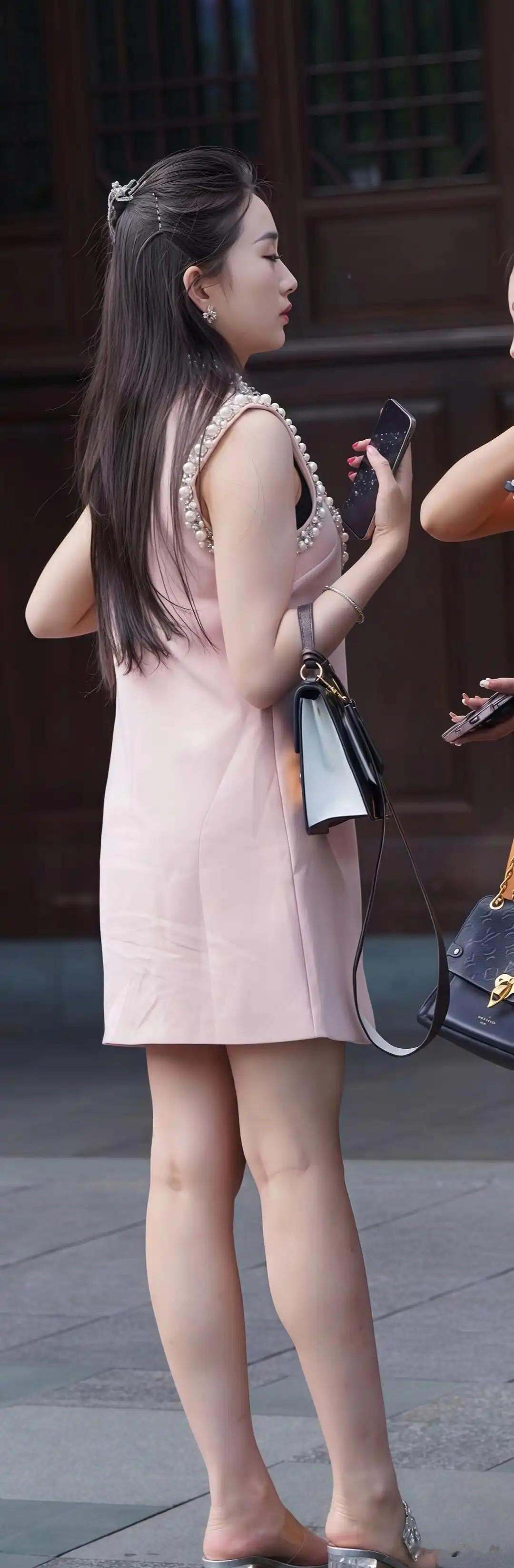 捕捉街头的一抹优雅,她从从容容,步伐坚定,粉色长裙轻轻摇曳,白色上衣简洁大方,金