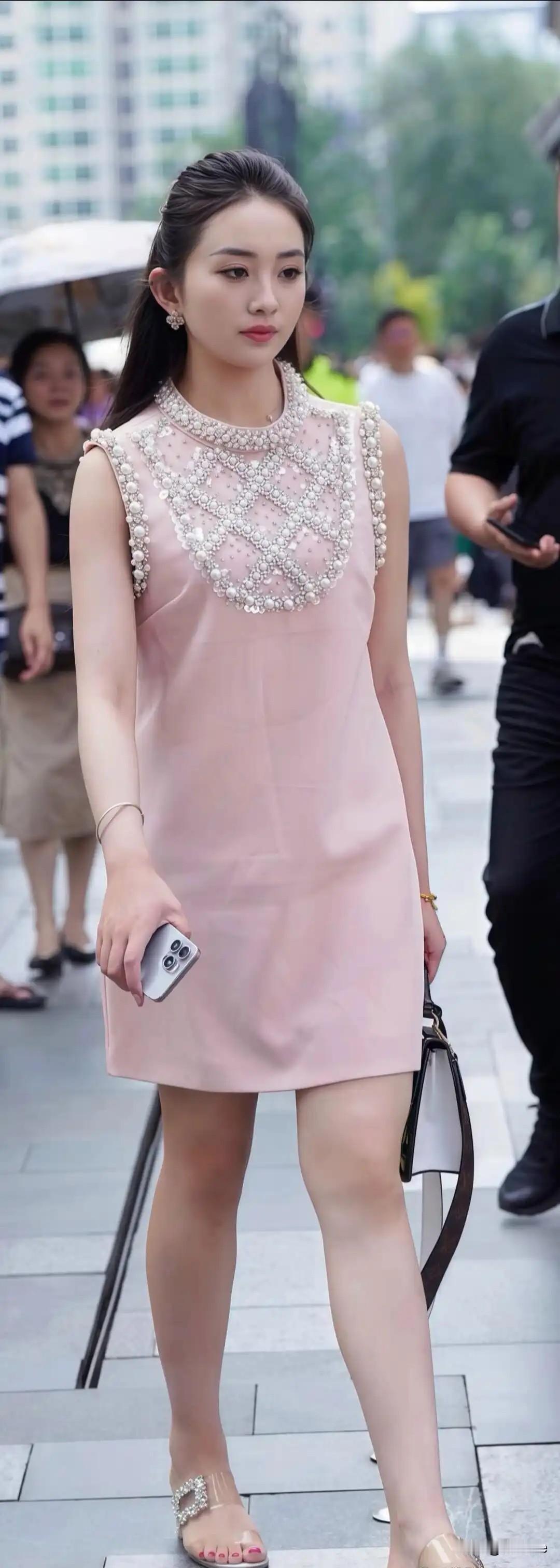 优雅粉色连衣裙,搭配闪亮项链,时尚街拍look