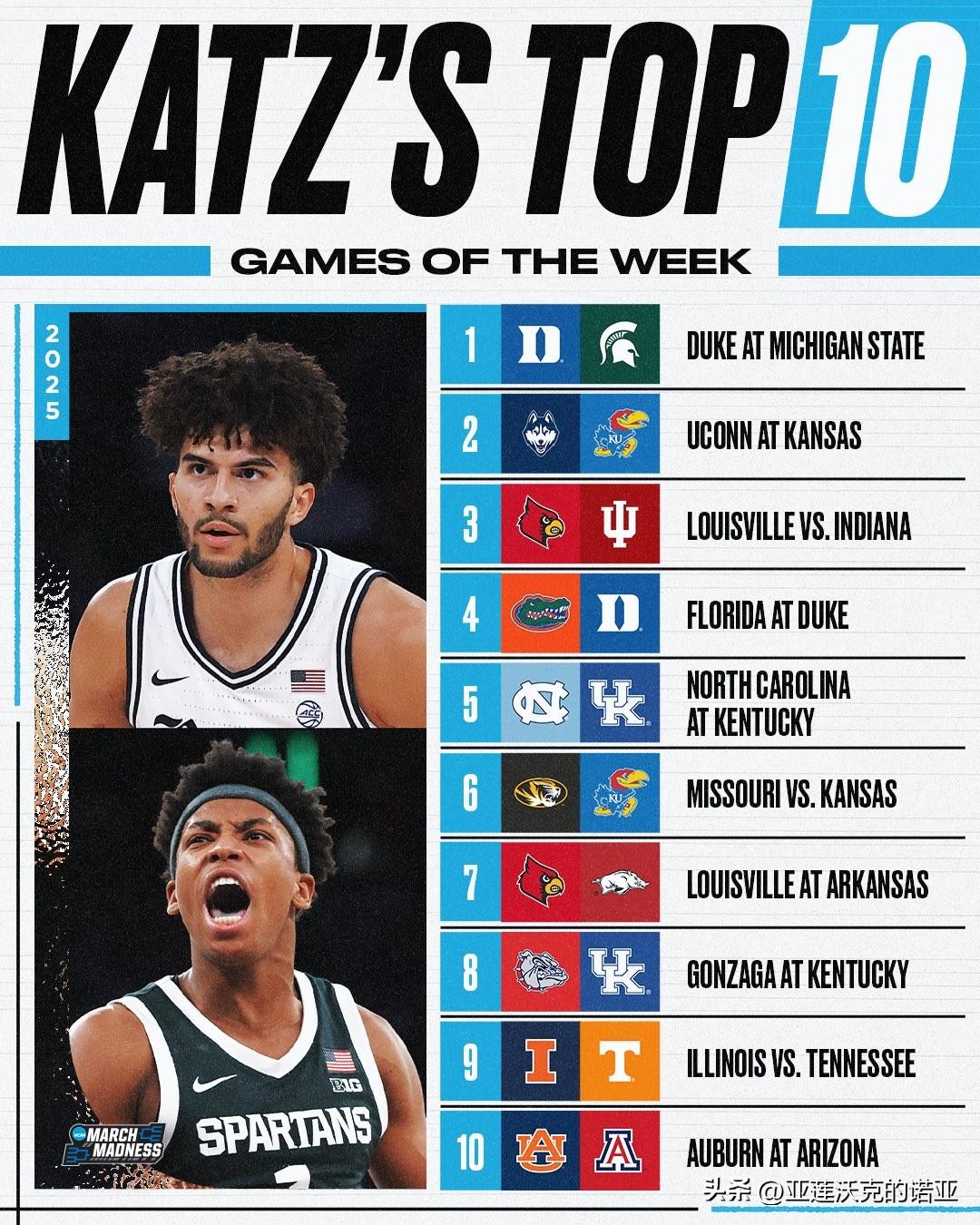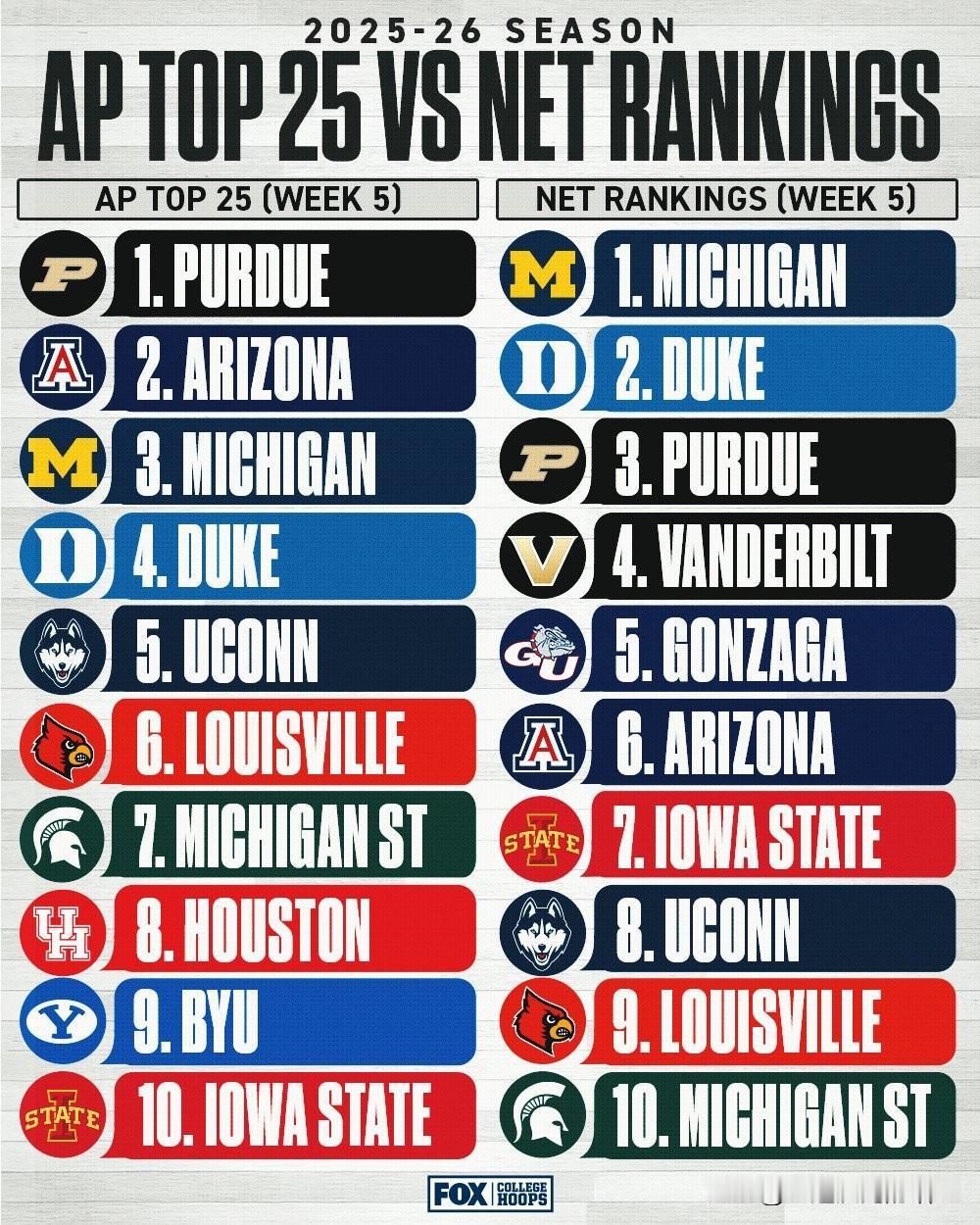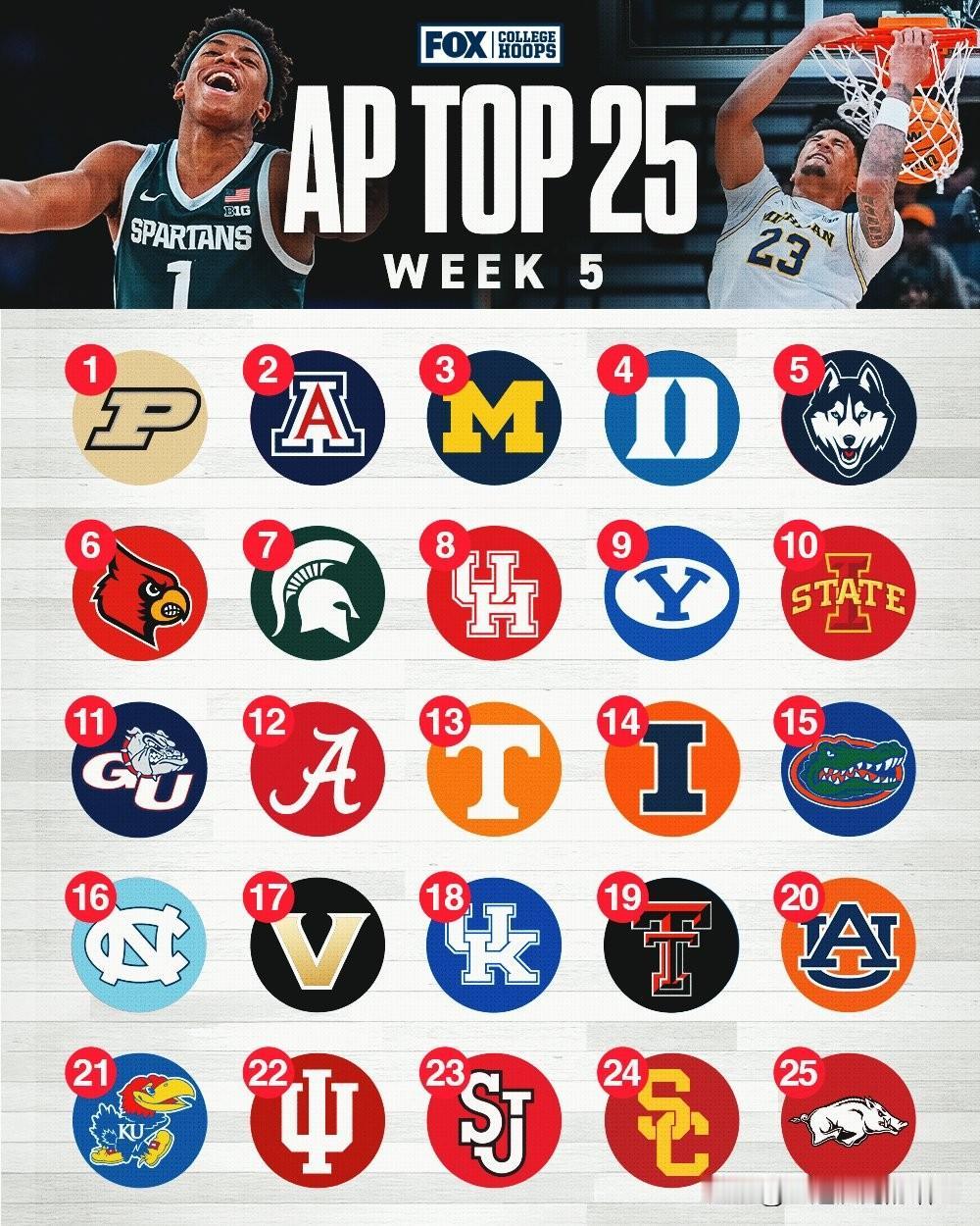 美联社公布第五周前25强榜单,普度大学再度登顶全美第一,亚利桑那与密歇根大学紧随其后,NET榜首则是密歇根大学,官网评选的上周最佳球队是密歇根大学,最佳球员是USC老将Chad Baker-Mazara,2026年nba选秀 最佳新人是杜克前锋Cameron Boozer。