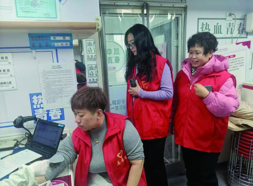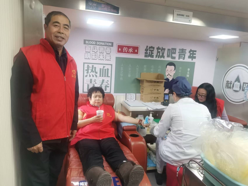 钱守文(左一)陪同志愿者献血。