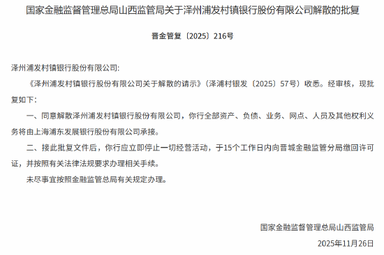 12月2日金融一线消息,国家金融监督管理总局山西监管局发布关于泽州浦发村镇银行股份有限公司解散的批复,同意解散泽州浦发村镇银行股份有限公司,泽州浦发村镇银行全部资产、负债、业务、网点、人员及其他权利义务将由上海浦东发展银行股份有限公司承接。
