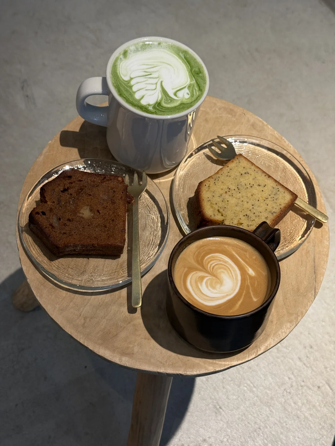点了杯抹茶拿铁,配一块柠檬籽蛋糕。