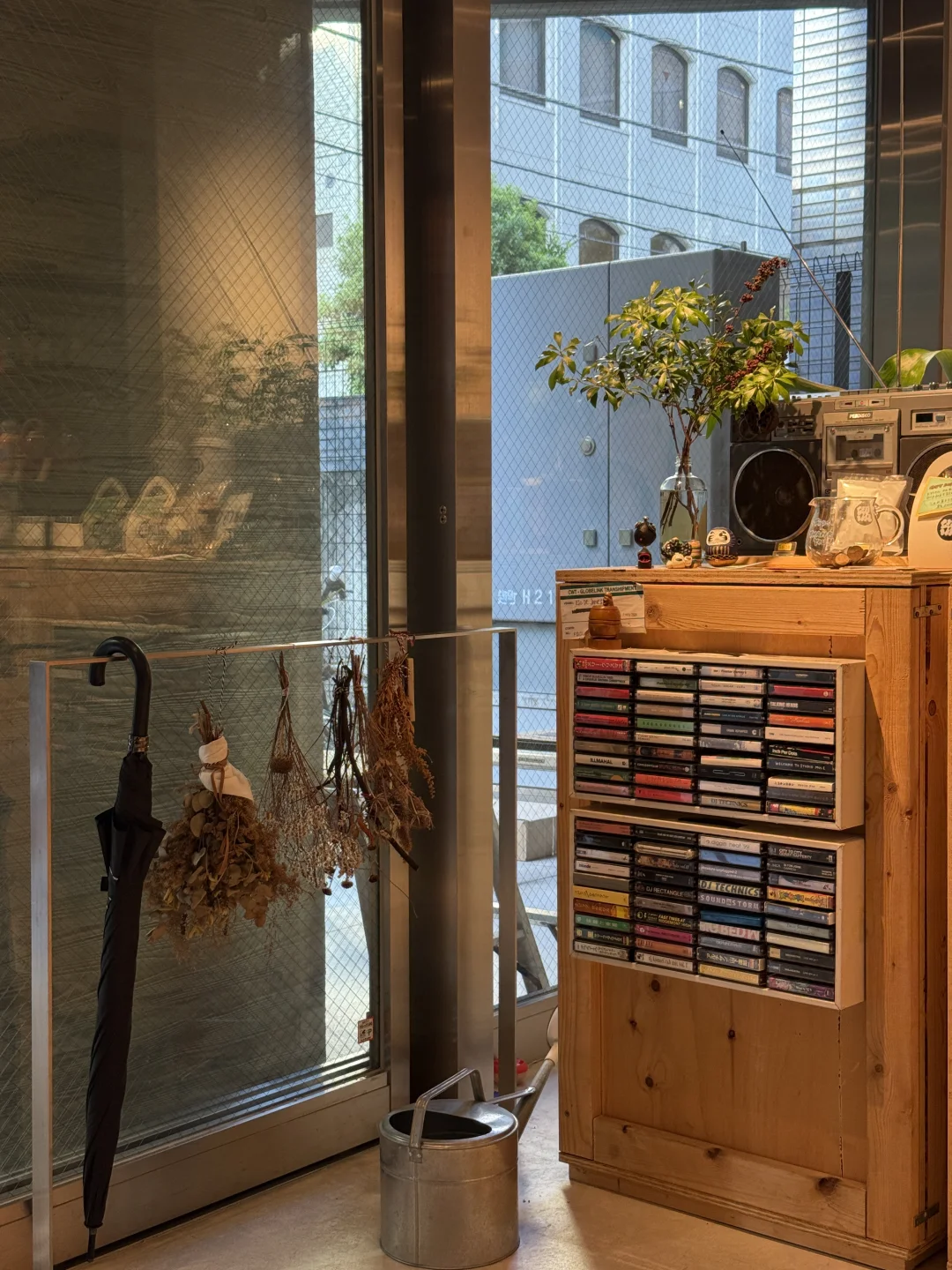 观察角落里装满磁带的老木柜,上面搁着复古录音机。