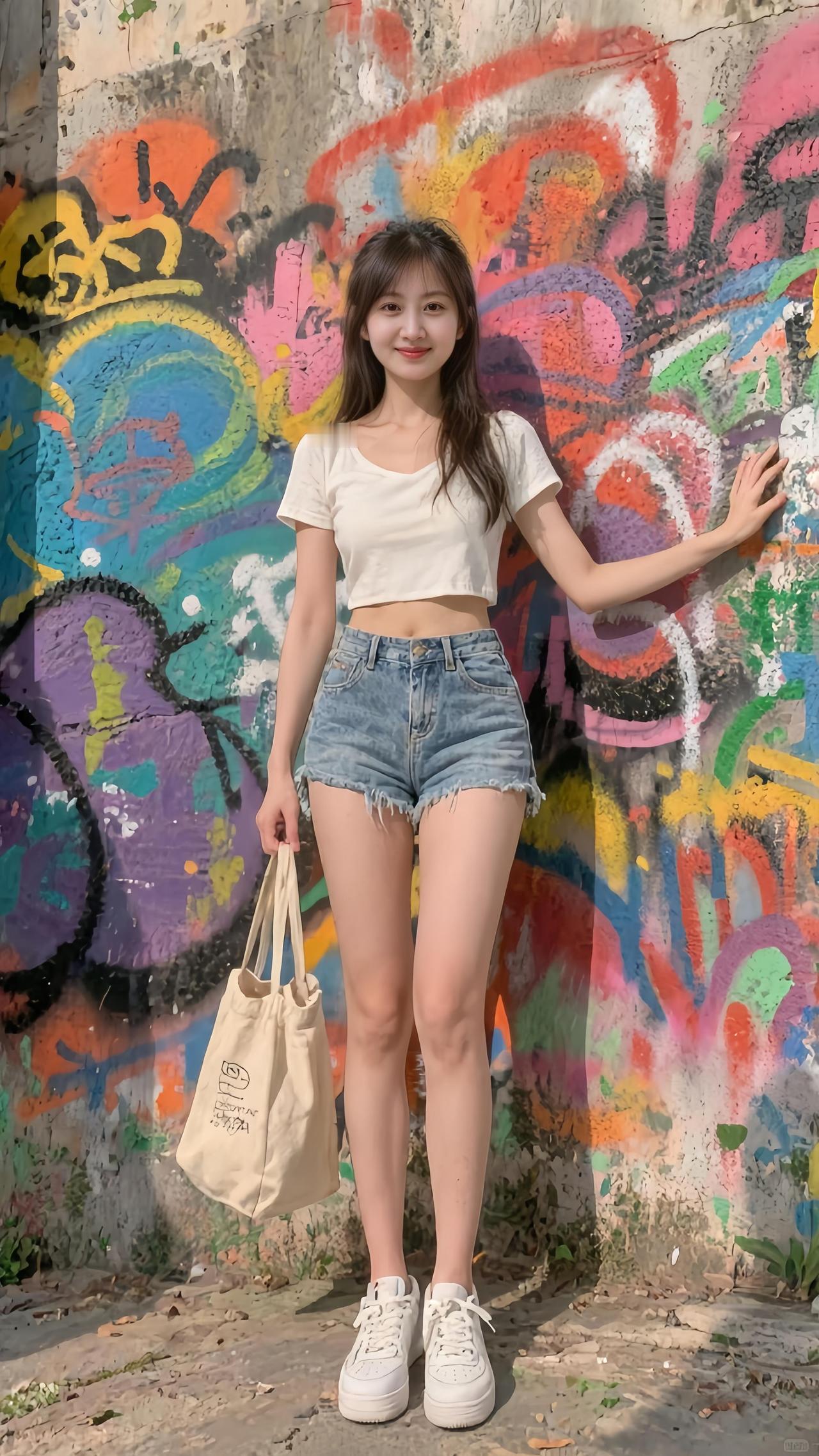 《鹧鸪天·晴墙绘里的风》 墙泼春云数缕霞,粉心裁入乱涂鸦。白衫轻裹腰如柳,牛仔新裁腿胜纱。 鞋落影,袋垂斜,笑涡偷蘸日边华。风来恰趁闲时好,偷把青春嵌进画。 晴光里这面墙像被打翻了颜料盘,粉的、紫的、蓝的泼得漫不经心,偏她往这乱彩里一站,白T恤衬得眉目比春色软,牛仔短裤裹着晃眼的腿,连帆布包垂着的弧度都带点懒。 笑起来时霞色都往她颊边靠,风也懂事儿,掀着发梢把这帧青春钉在了涂鸦墙的缝隙里,连斑驳的墙皮都沾了点鲜活的甜。