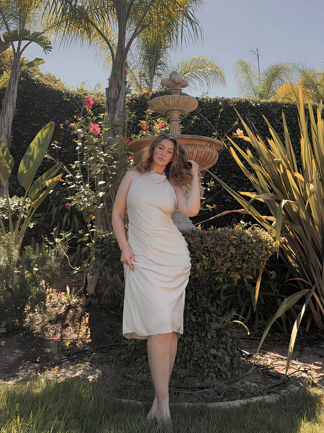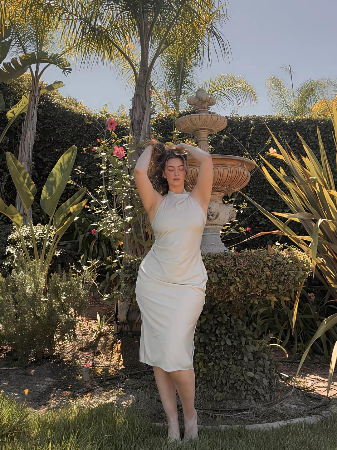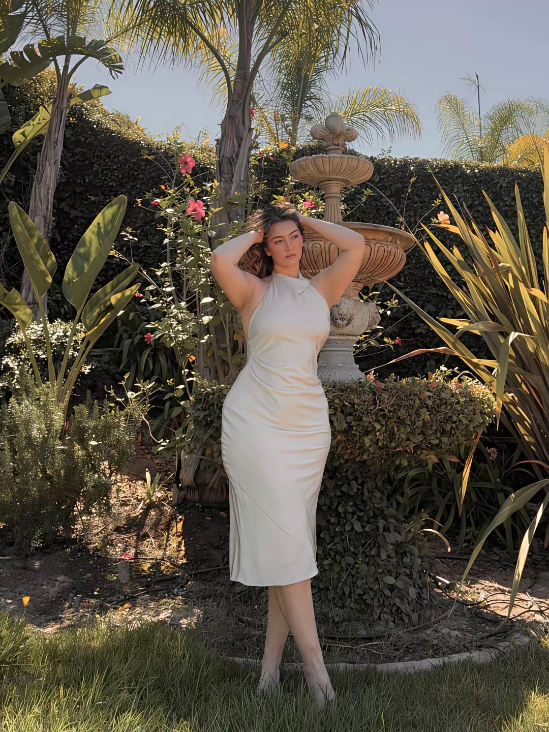 她身着一袭灰白色连衣裙,简约的剪裁勾勒出匀称修长的身形。纤细的腰肢与微敞的裙摆形成优美弧度,行走时裙袂轻扬,淡金色长发在肩头流淌。阳光落在她身上,棉质面料泛起柔和光泽,衬得肌肤愈发通透。那双腿笔直纤长,步履间自带韵律,宛如溪边缓步的白鹭。微风拂过,裙裾贴紧腰臀曲线又翩然散开—在暖阳里融出清泠的剪影。