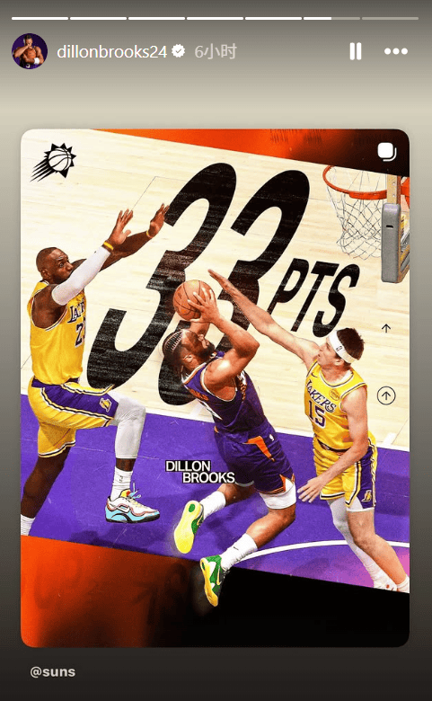 赛后,狄龙-布鲁克斯在社交媒体上转发了一张自己上篮的照片,照片里勒布朗-詹姆斯和奥斯汀-里夫斯当了背景板。