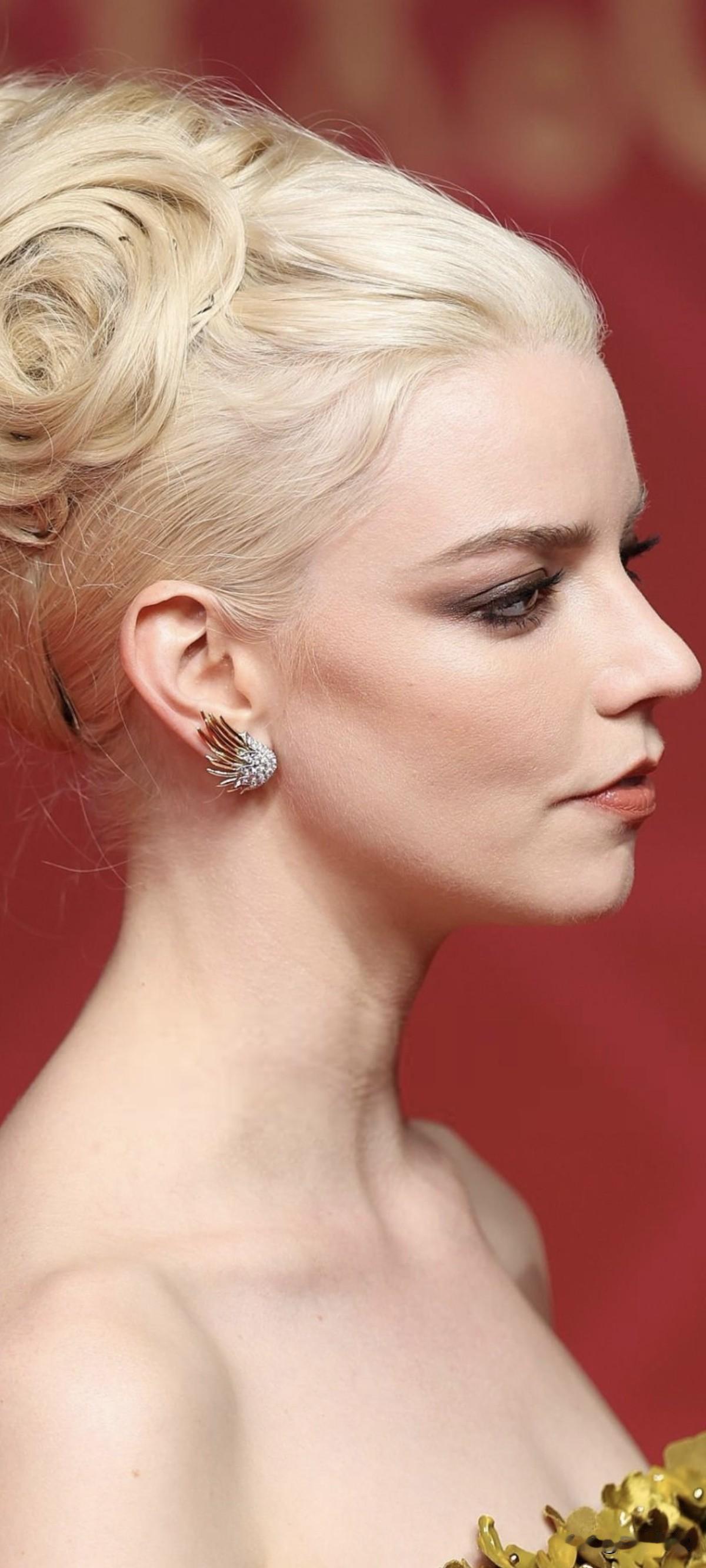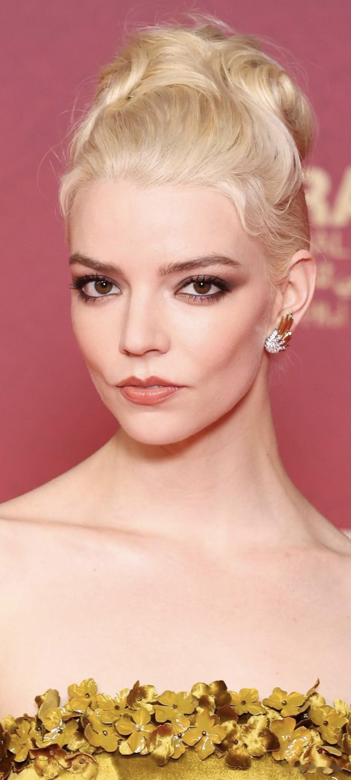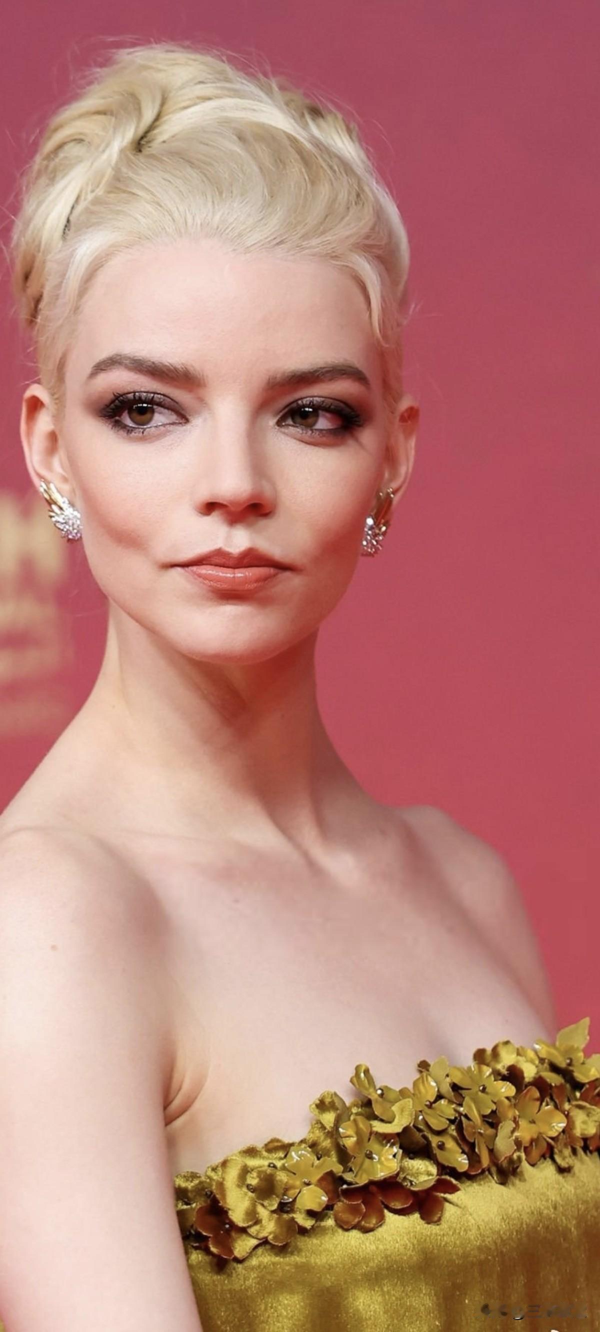 Taylor-Joy在摩洛哥出席第22届马拉喀什电影节,穿了一条金色的Dior礼服裙,这颜色很衬她的肤色,显得气色很美好,褶皱裙摆和饰有花朵的上身呈现出一种根植于高级定制传统的浪漫轮廓。翅膀形状的 Tiffany & Co. 耳环也很亮眼!