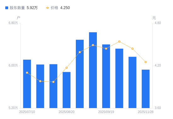 日期A股户数(户)流通A股户均持股数(股)户均持股市值(万元)2025-11-285923524318.6410.342025-10-206165623363.7410.372025-09-306318422798.7310.352025-09-196399022511.5610.002025-09-106628221733.129.762025-08-296486922206.529.752025-08-205880124498.1310.222025-07-316026223904.209.492025-07-186021023924.849.522025-07-106112423567.099.66
