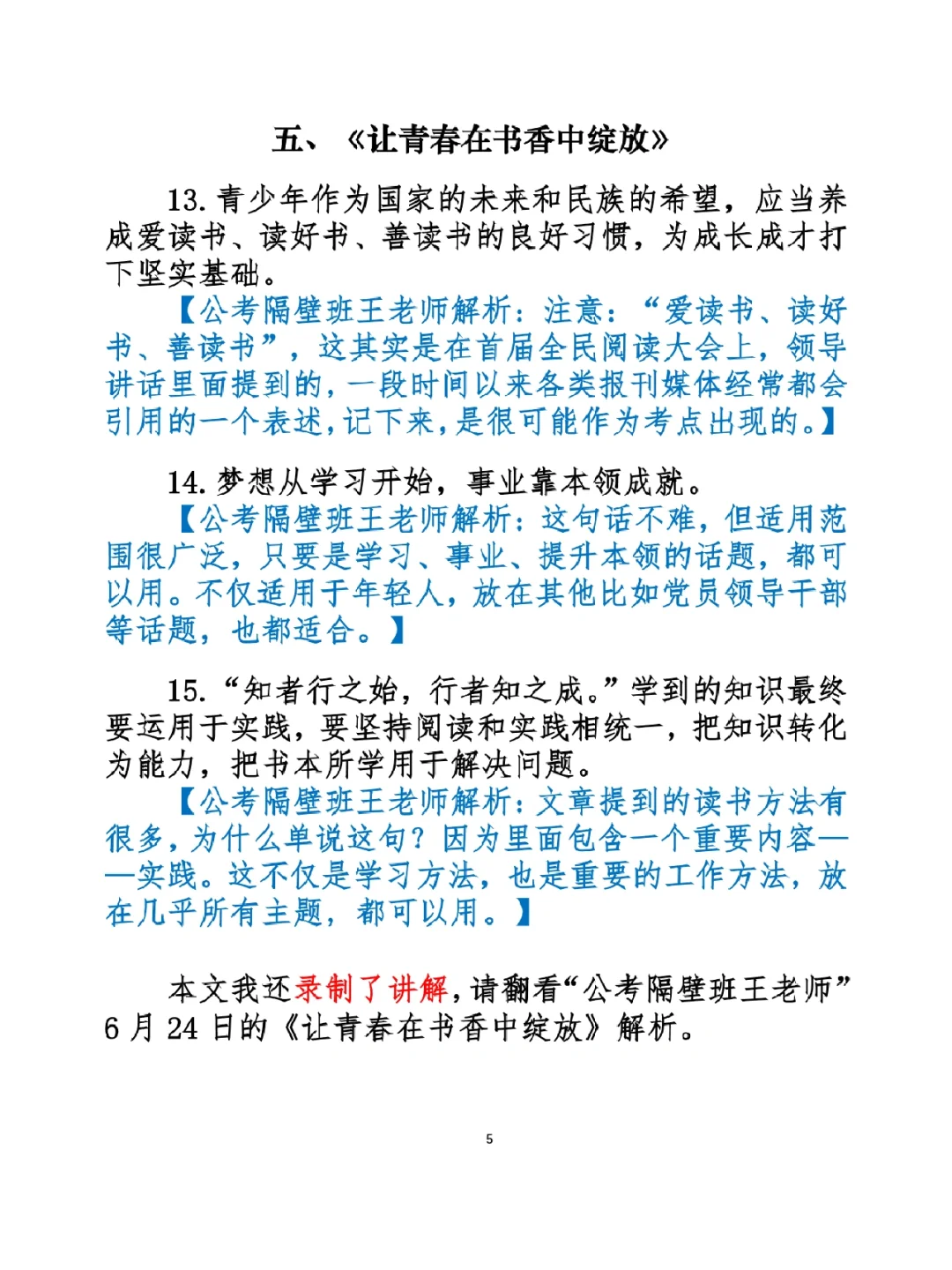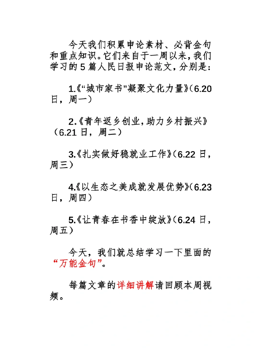 今天我们积累申论素材、必背金句和重点知识。它们来自于一周以来,我们学习的5篇人民日报申论范文,分别是: