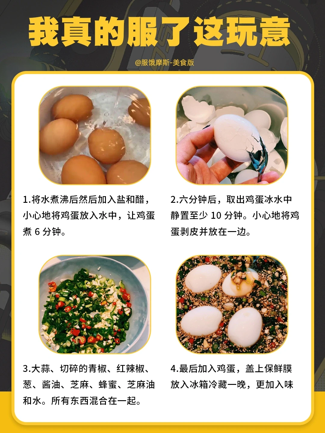 🎙🎙🎙我要告诉全世界鸡蛋这样做,真的很好吃,直接破防。 🍳🍳🍳一口气能炫好几个!!! 🥚酱油溏心蛋做法: ❤️1.将水煮沸后然后加入盐和醋,小心地将鸡蛋放入水中,让鸡蛋煮 6 分钟。 ❤️2.六分钟后,取出鸡蛋冰水中静置至少 10 分钟。小心地将鸡蛋剥皮并放在一边。 ❤️3.大蒜、切碎的青椒、红辣椒、葱、酱油、芝麻、蜂蜜、芝麻油和水。所有东西混合在一起。 ❤️4.最后加入鸡蛋,盖上保鲜膜放入冰箱冷藏一晚,更加入味。 📖tips:鸡蛋不要煮超过7分钟,最好控制在6分钟,才能让溏心更嫩! -