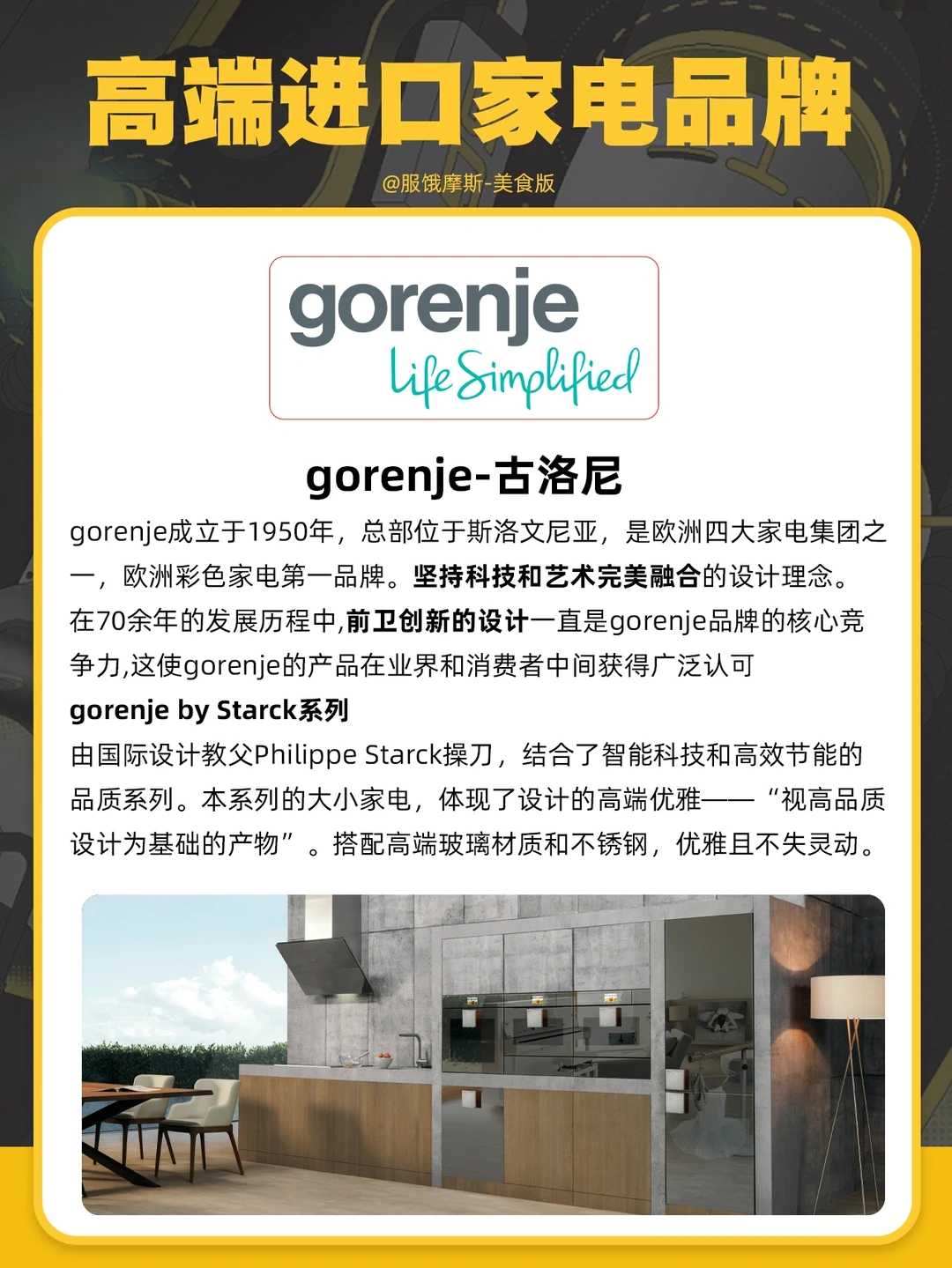 gorenje成立于1950年,总部位于斯洛文尼亚,是欧洲四大家电集团之一,欧洲彩色家电第一品牌。坚持科技和艺术完美融合的设计理念。真正符合现代人审美的高端家电。