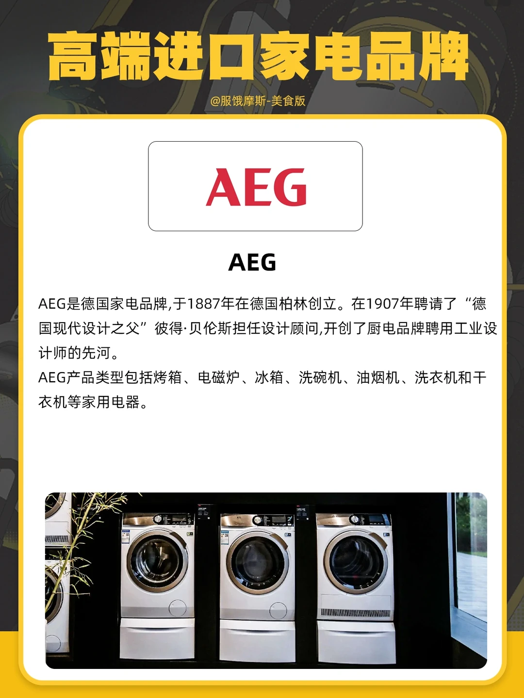 AEG于1887年在德国柏林成立,产品涉及多种品类,包括烤箱 、灶具、油烟机等厨电产品、冰箱、洗衣机等大家电产品,以及咖啡机、洗碗机等类型产品。