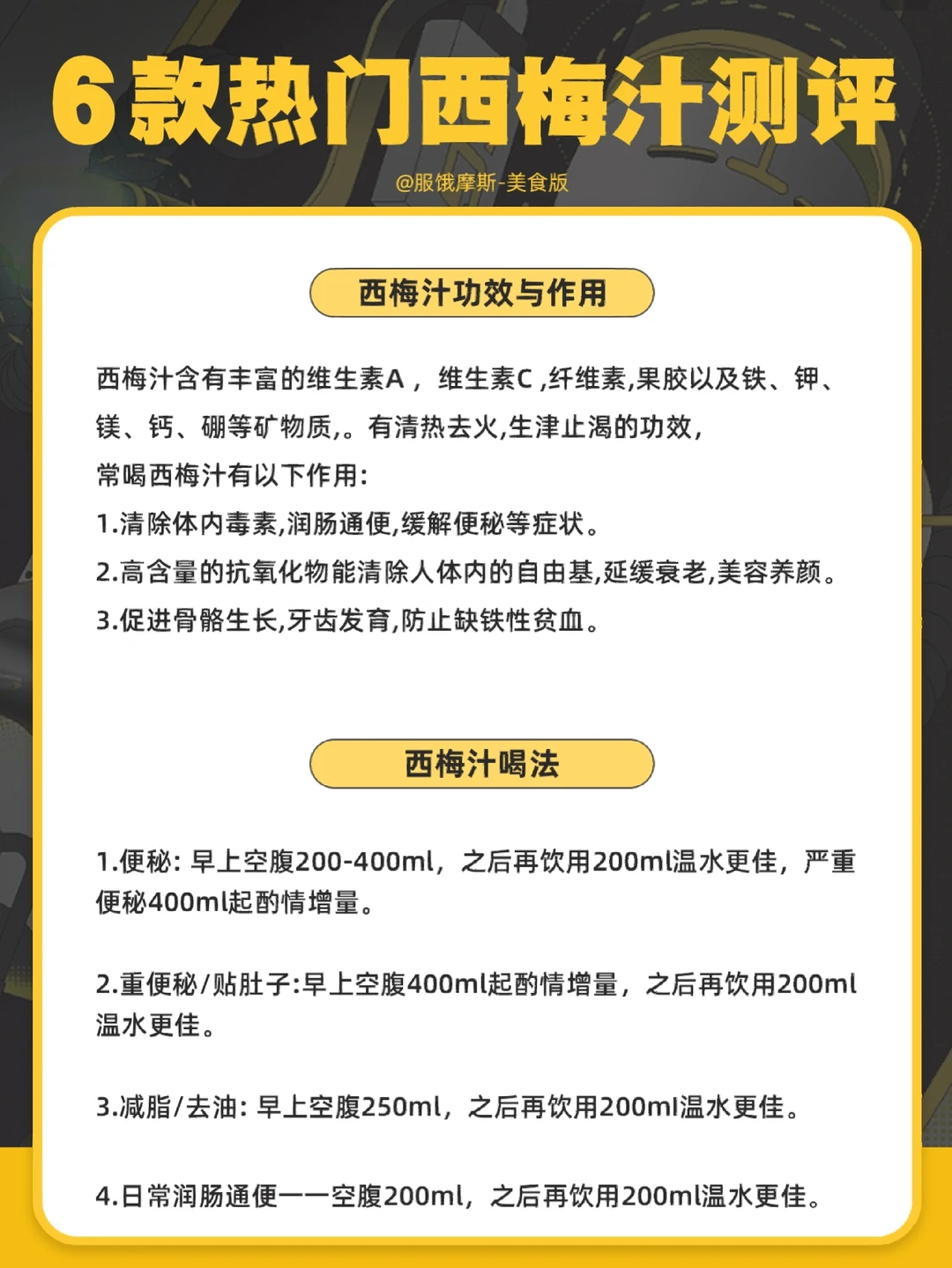 1.便秘: 早上空腹200-400ml,之后再饮用200ml温水更佳,严重便秘400ml起酌情增量。
