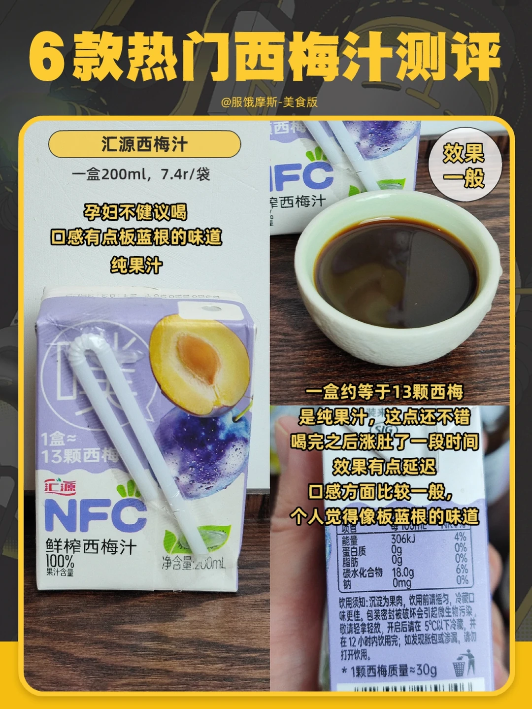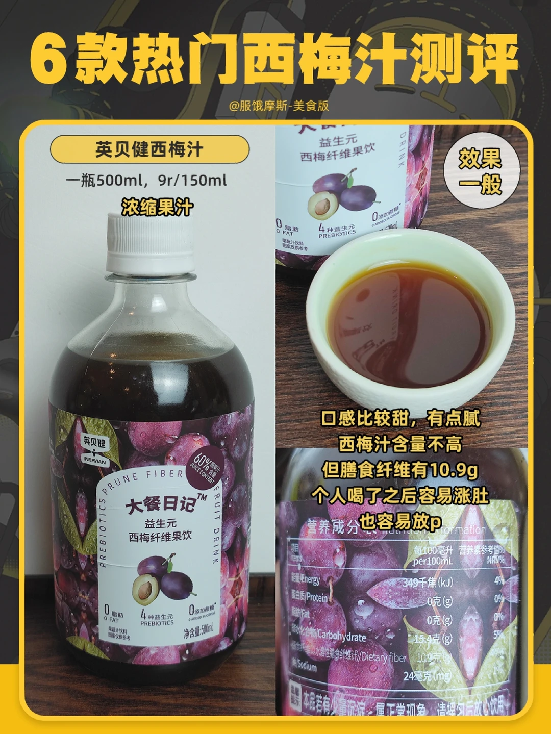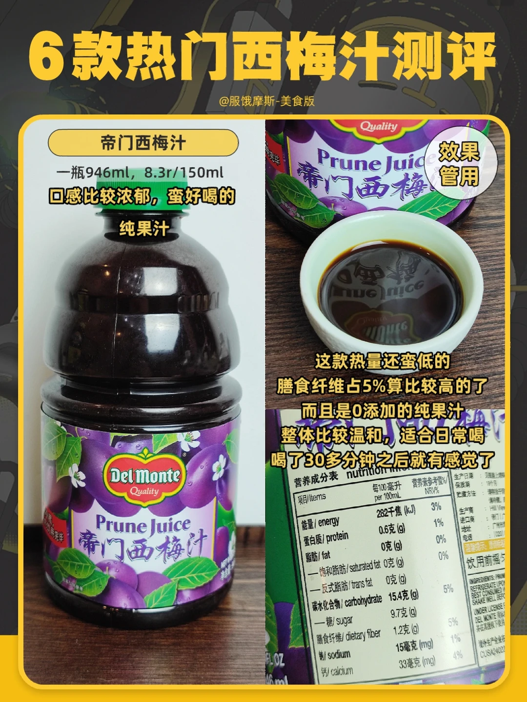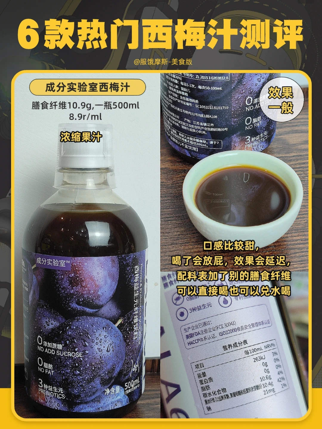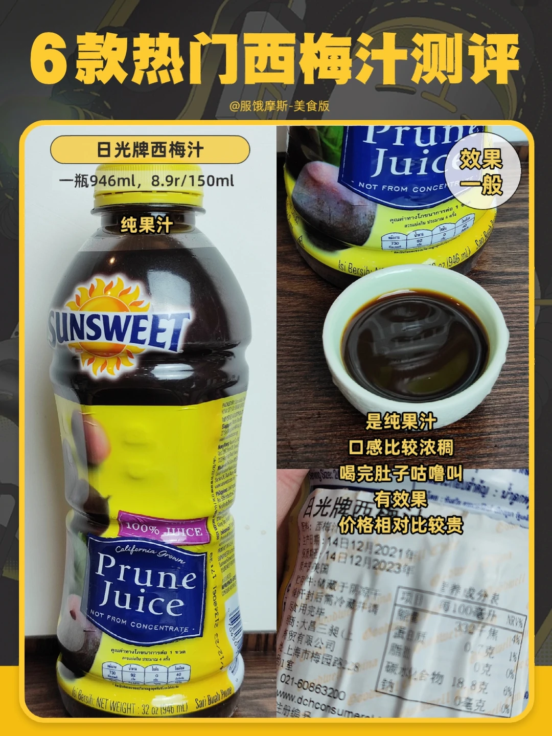 口感比较甜,有点腻,西梅汁含量不高,但膳食纤维有10.9g 。个人喝了之后容易涨肚 也容易放p。
