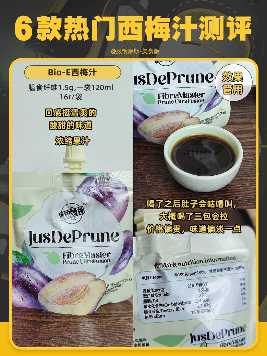 6款西梅汁试下来,帝门西梅汁和Bio-E西梅汁效果比较好。但帝门西梅汁是纯果汁0添加,而Bio-E西梅汁属于浓缩⻄梅汁价格也比较贵。