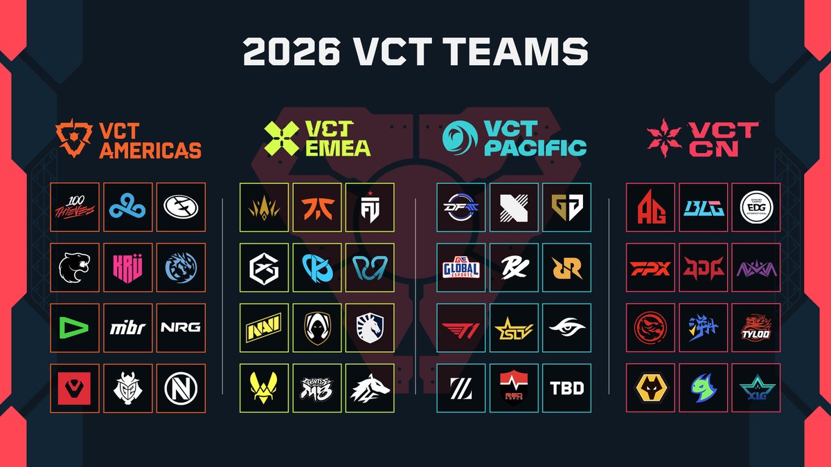 虎扑12月03日讯VCT赛事官方公布2026年参加VCT的所有48支战队: