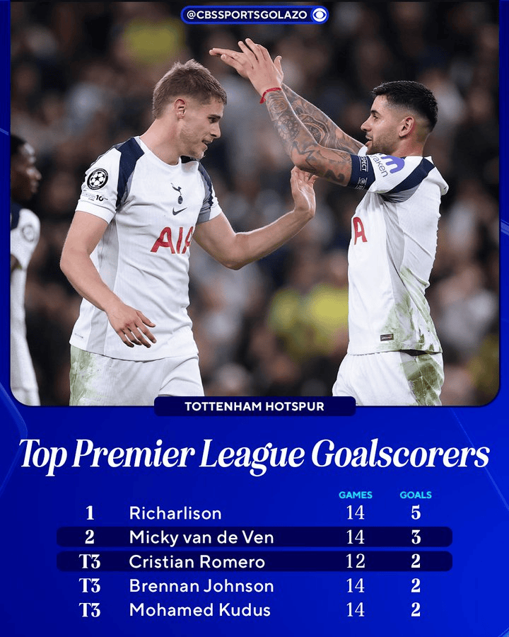 虎扑12月03日讯在对阵纽卡斯尔联梅开二度后,罗梅罗上升到了热刺本季队内英超射手榜的并列第三位。