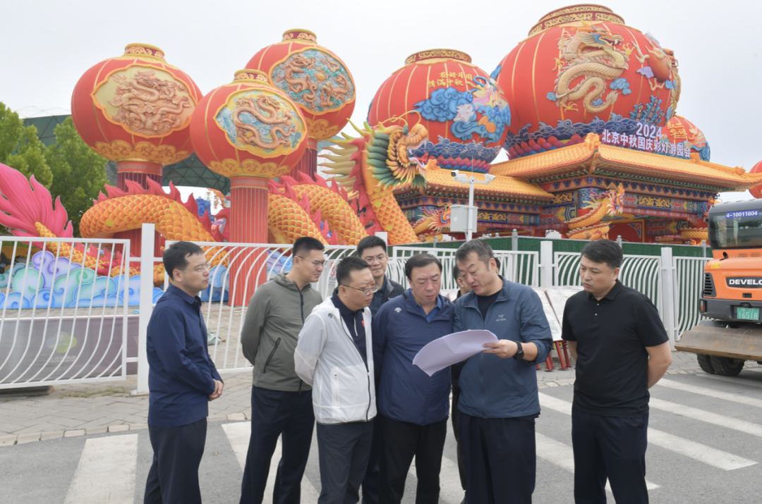 董亦军(右三)在2024中秋国庆彩灯会举办前夕,前往游园会现场对人员、车辆路线进行调研。