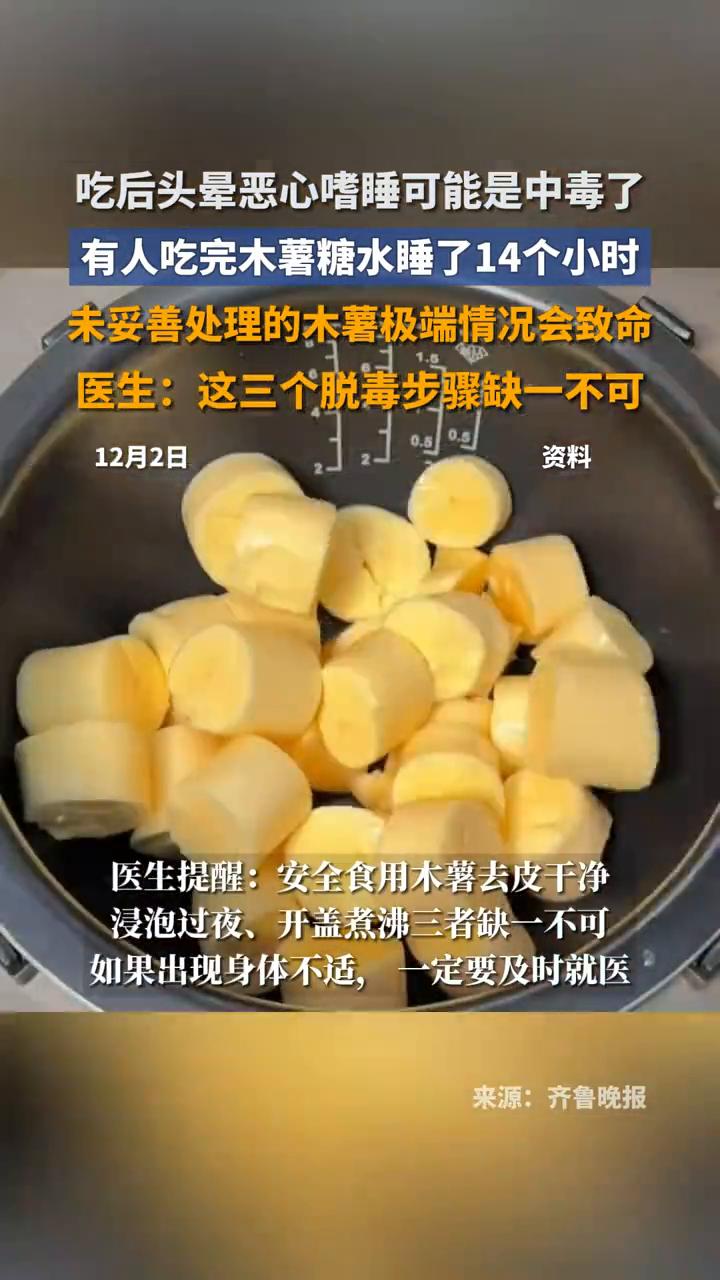 吃后头晕、恶心、嗜睡可能是中毒了。 齐鲁晚报。 有人吃完木薯糖水睡了14个小时,未妥善处理的木薯极端情况会致命。医生:这三个脱毒步骤缺一不可。 12月2日,最近在各大平台上自制木薯糖水火出圈。不过,也有人说在食用自制木薯糖水后,"疑似中毒"出现了头晕、恶心、呕吐等症状。据悉食用未妥善处理的木薯存在中毒风险,木薯的氰苷毒素会导致窒息性中毒,在极端情况下甚至可能致命。 医生提醒:安全食用木薯去皮干净,浸泡过夜、开盖煮沸三者缺一不可。如果出现身体不适,一定要及时就医。木薯糖水 黄金木薯糖水 木薯甜汤 木薯糖水配方 红糖水木薯 广东木薯糖水 甜滋木薯羹