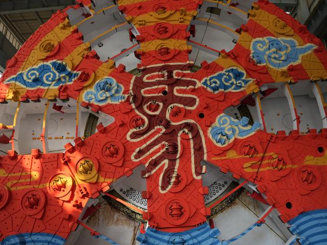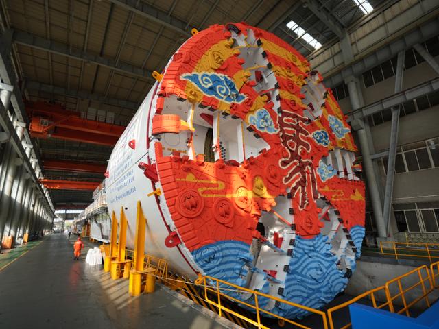 超大直径泥水平衡盾构机“诗城创新号”盾构刀盘开挖直径15.07米,设备总长度145米,整机重量约4500吨(其中刀盘重约600吨),最大推力达2.2万余吨,泥浆循环流量3200立方米每小时,是名副其实的“穿江巨龙”。