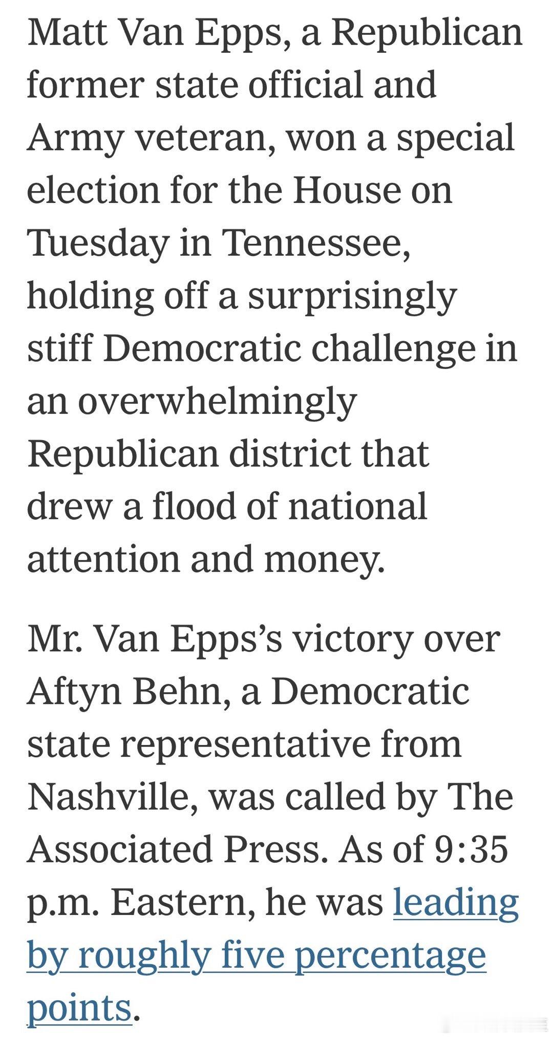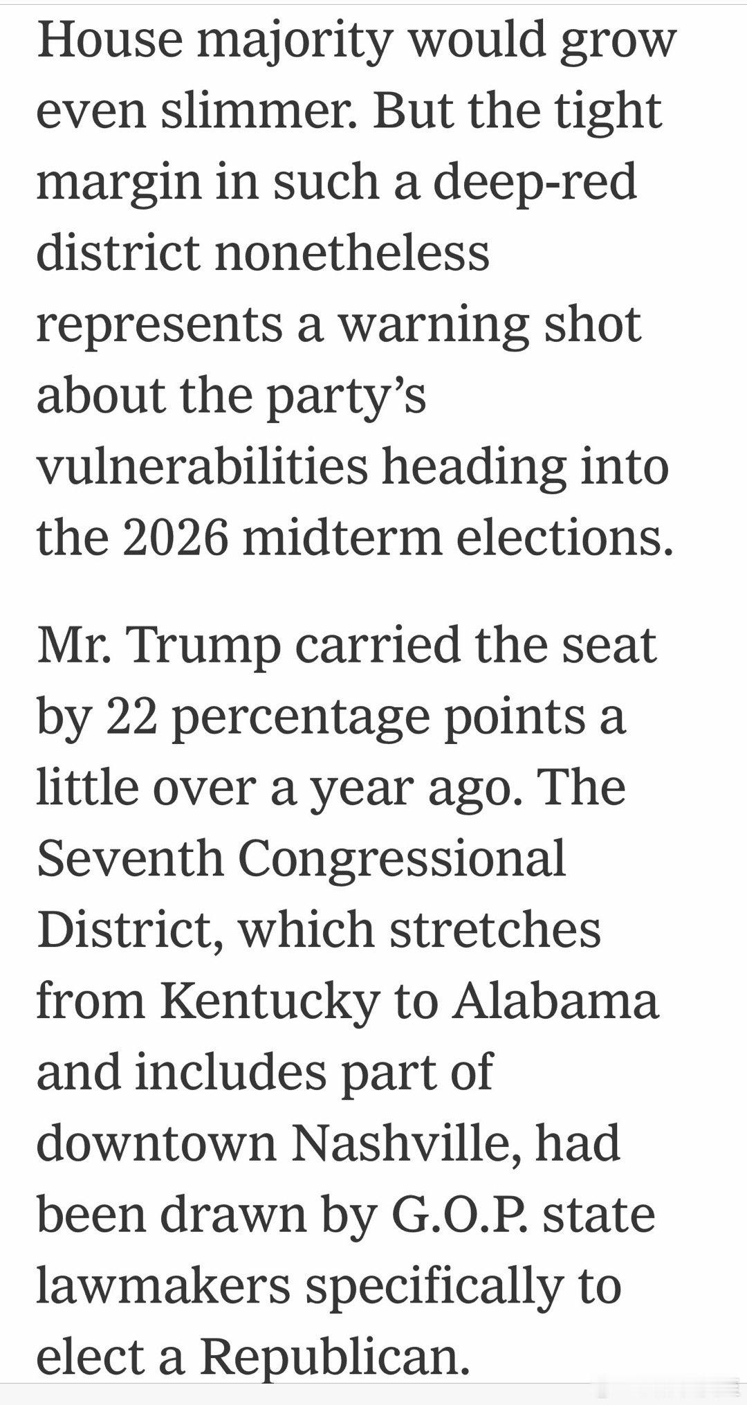 田纳西第七选区的特别选举,共和党保住了这个联邦众议员席位美联社发布预测结果时,民主党候选人只落后五个百分点去年11月,这个区Trump领先22个点如果趋势持续,明年中期选举,民主党很难翻蓝深红区,但在共和党优势不明显的浅红或摇摆区,有希望获得更多席位(中期选举前,会是R220-D215)
