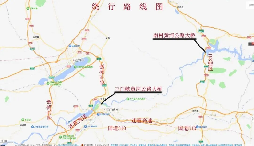 限行车辆可绕行连霍高速—侯平(运三)高速、连霍高速—呼北高速、G310线--G241线南村黄河大桥通行。