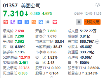 上证报中国证券网讯(记者李五强)12月3日,美图公司(01357.HK)H股延续下跌态势,盘中一跌逾6%。截至11时38分,美图公司股价报7.31港元/股,跌4.69%。公司股价已连续四个交易日下跌,期间累计跌幅近17%。