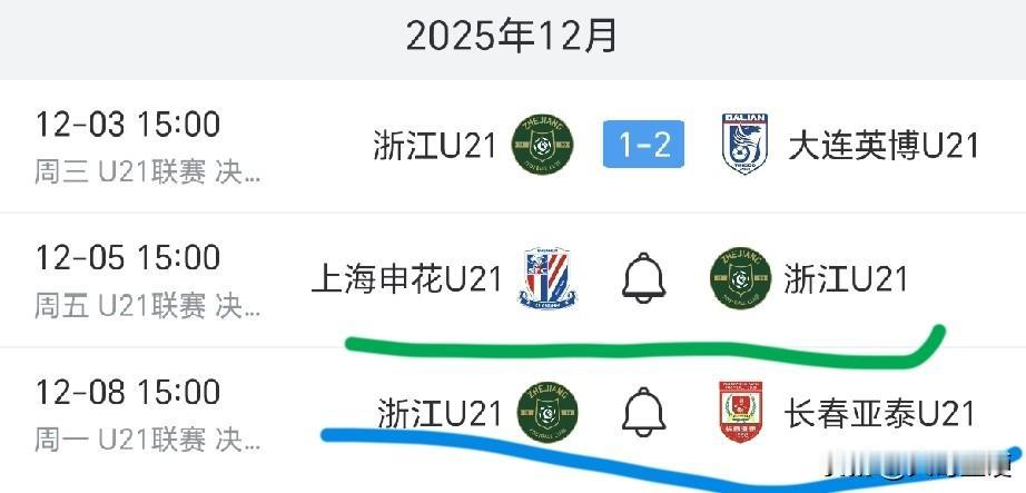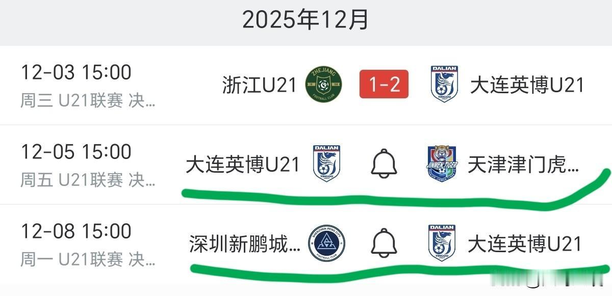 夺冠在望!大连英博U21队2:1拿下浙江U21队!霍深坪得到4.1分的超低分[点亮平安灯] 北京时间12月3日15:00,2025赛季U21联赛天王山之战,大连英博U21队VS浙江U21队的比赛正式打响[加油] 最终经过90分钟鏖战,大连英博U21队2:1拿下浙江U21队,赢下天王山之战,距离夺冠只剩最后两场比赛[大金牙] 本场比赛,两队可谓是旗鼓相当,队内都有多名名将压阵,大连英博U21队有朱鹏宇、毛伟杰、黄山压阵,浙江U21队这边则是由王钰栋、霍深坪、张瑷晖压阵[震惊] 大连英博U21队后防线,凭借顽强的防守,顶住了当红炸子鸡王钰栋的冲击,最终凭借朱鹏宇的进球扳平比分,闫奕涵在第88分钟的任意球绝杀,在先丢一球的情况下,以2:1逆转了浙江U21队[赞] 值得一提的是!大连球迷经常念叨的,浙江U21队门将霍深坪,得到了4.1分的超低分[笑哭] 按照既定赛程,大连英博最后两场将分别对阵天津津门虎U21队、深圳新鹏城U21队,而浙江U21队则分别对阵上海申花U21队和长春亚泰U21队,浙江U21队后两场的难度明显大于大连英博U21队[泪奔] 也就是说,只要大连英博U21队自己不犯错误,今年U21联赛冠军奖杯,可以说基本上到手了[笑哭] 由于U21联赛冠军将和大连涵瑀争夺明年最后一个中乙名额,这也就预示着,继大连可为之后,明年大连将拥有两支中乙球队[加油] 不得不说,大连英博U21队这场天王山之战,可以说是为今年的大连足球,划上了一个完美的句号,明年可期[点亮平安灯]