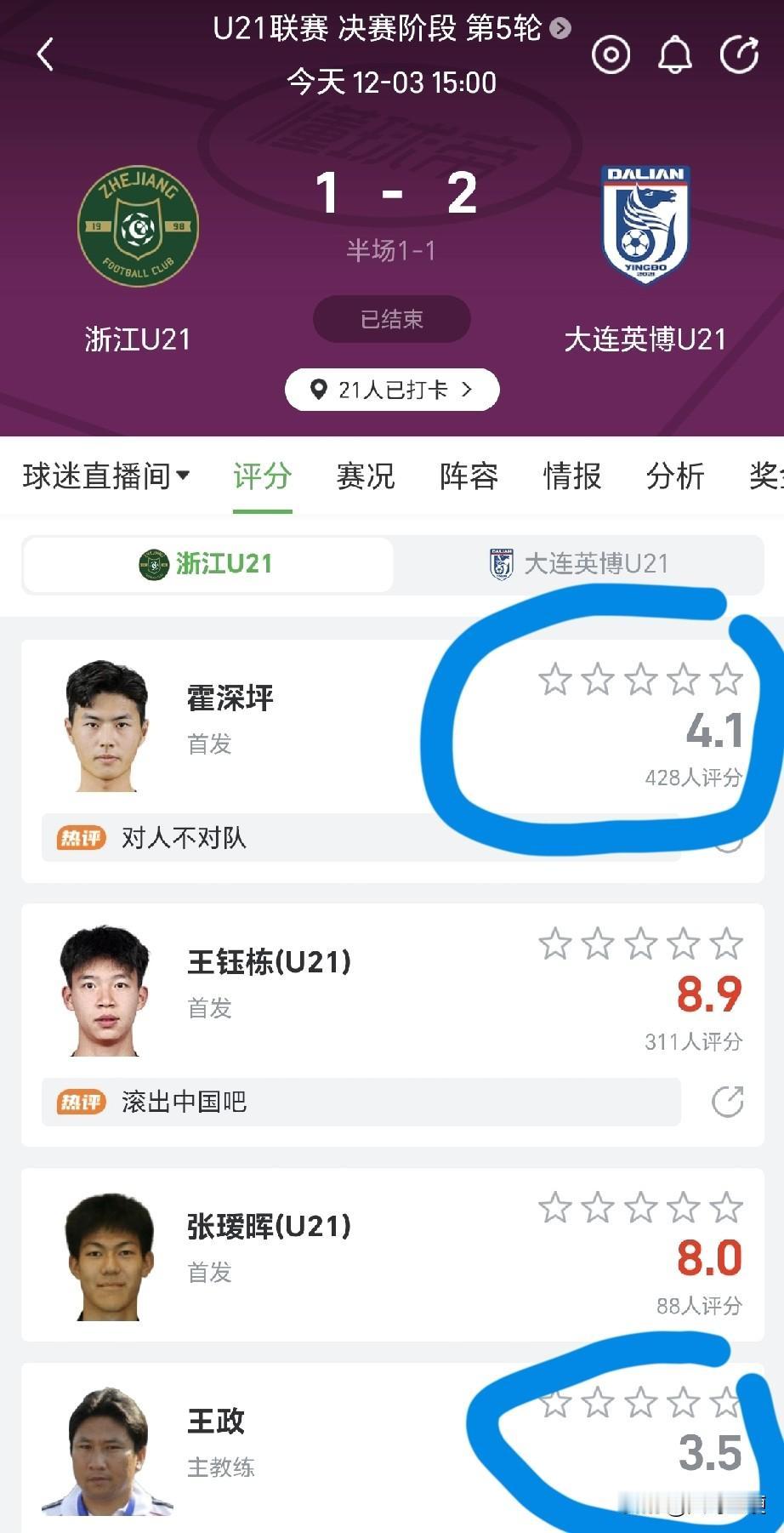 夺冠在望!大连英博U21队2:1拿下浙江U21队!霍深坪得到4.1分的超低分[点