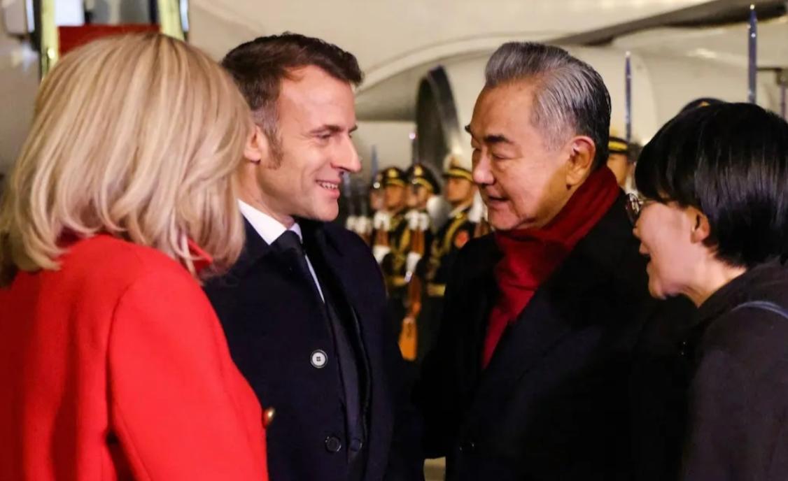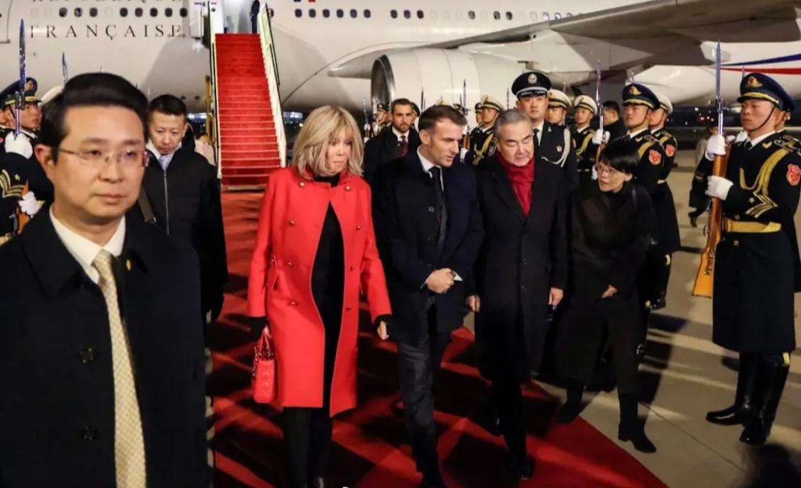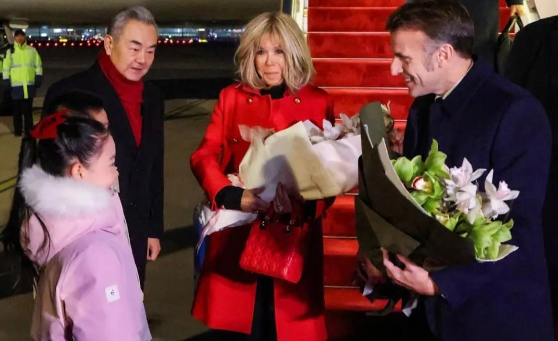 马克龙夫妇抵达北京的高清照来啦!法国夫人抱着鲜花气色好,献花小姑娘穿着粉色棉衣亭