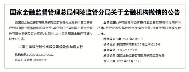 经国家金融监督管理总局铜陵监管分局批准撤销中国工商银行股份有限公司铜陵中和园支行,其业务归并至中国工商银行股份有限公司铜陵百大支行,收回《中华人民共和国金融许可证》。现予以公告: