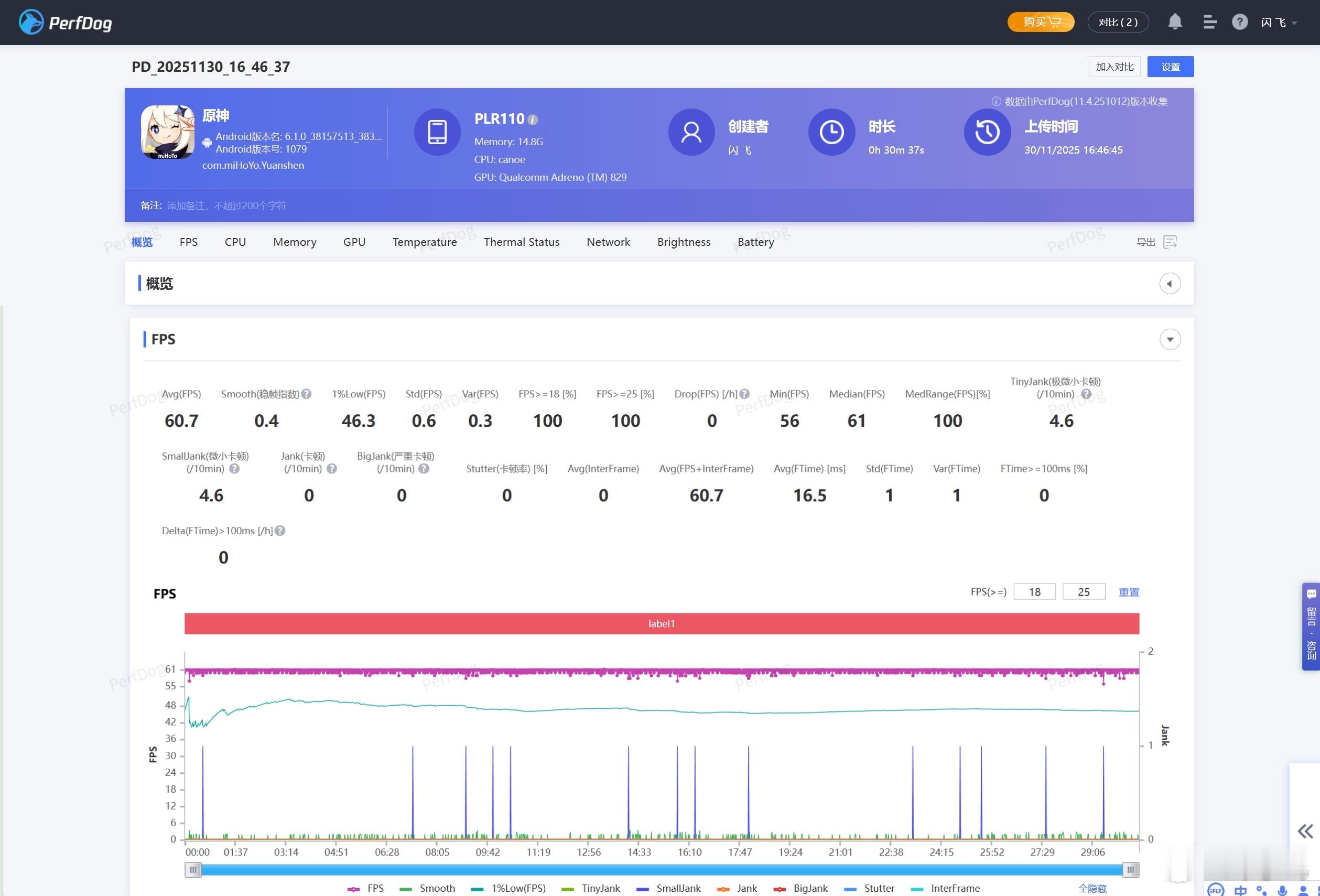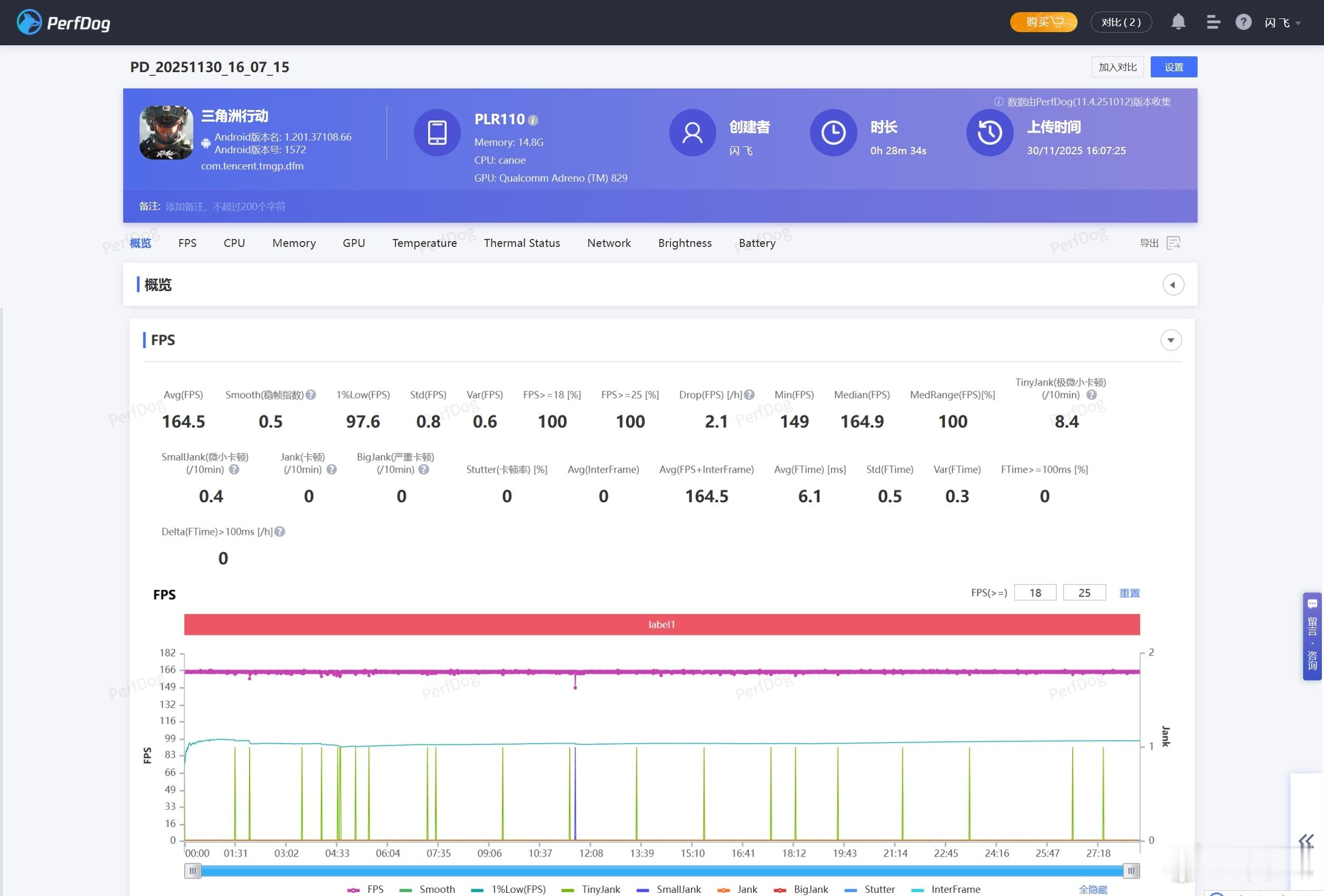 看到一加Ace6T第一眼真的眼前一亮,一加简直是古希腊掌管色彩的神,走低饱和小清新的一加Ace 6T「掠影绿」和一加13T的「怦然粉」,我单方面宣布是今年手机配色天花板。外观还是延续家族式设计,铝合金中框加丝绸玻璃后盖,完全不沾指纹,质感依旧在线。尤其这个绿色绝了,真机比照片好看太多,不同光线下呈现的效果不太一样,建议大家去线下店看看。首发第五代骁龙8处理器,跑分咱也不跑了,直接看实测,通过腾讯PerfDog平台测试,最近很火的《三角洲行动》里,烽火地带一局打满30分钟下来,平均帧率164.5帧,帧率全程稳的一批,独家的165Hz《三角洲行动》谁玩谁知道,这一局我和队友一起灭了3队……传统艺能《原神》也测了,璃月港跑图30分钟,一加Ace 6T仍然是做到了满帧运行,1% Low帧46.3帧,没有明显帧率波动,果然和《原神》长期深度合作有点东西哈,轻松拿捏。8300mAh大电池开启了一个新时代,三星用户看了沉默,iPhone用户看了流泪……设定屏幕亮度50%,一小时在线1080P视频+一小时短视频+一小时《原神》,剩余电量88%,即使重度使用一整天还能剩不少,彻底终结续航焦虑。加上100W闪充,大电池+快充我全都要!总结一下,旗舰性能大型游戏不在话下,这次也将165Hz游戏体验普及给了更多用户,续航彻底告别充电宝,质感同档无敌,一加Ace 6T现在2399起实在太香