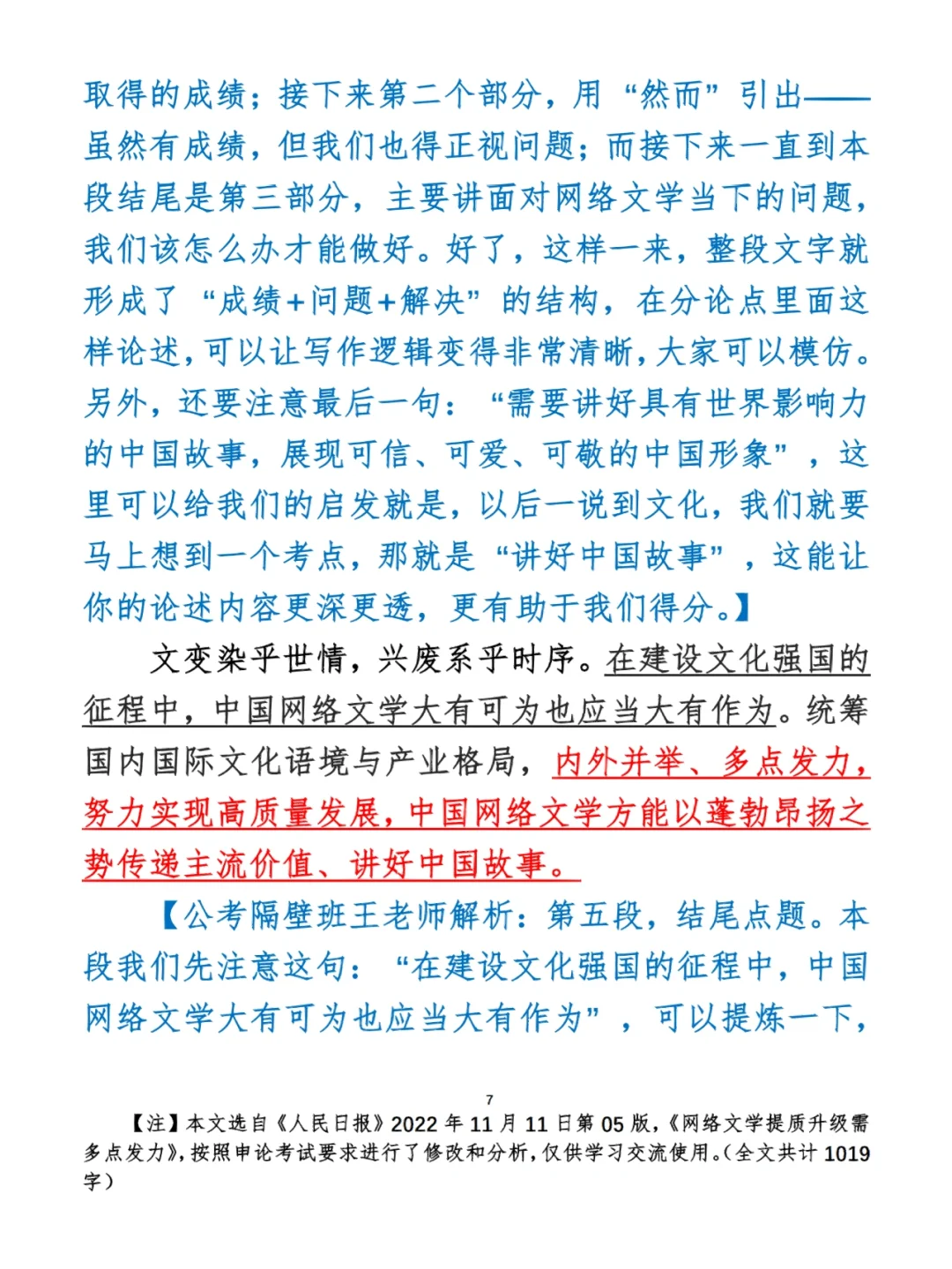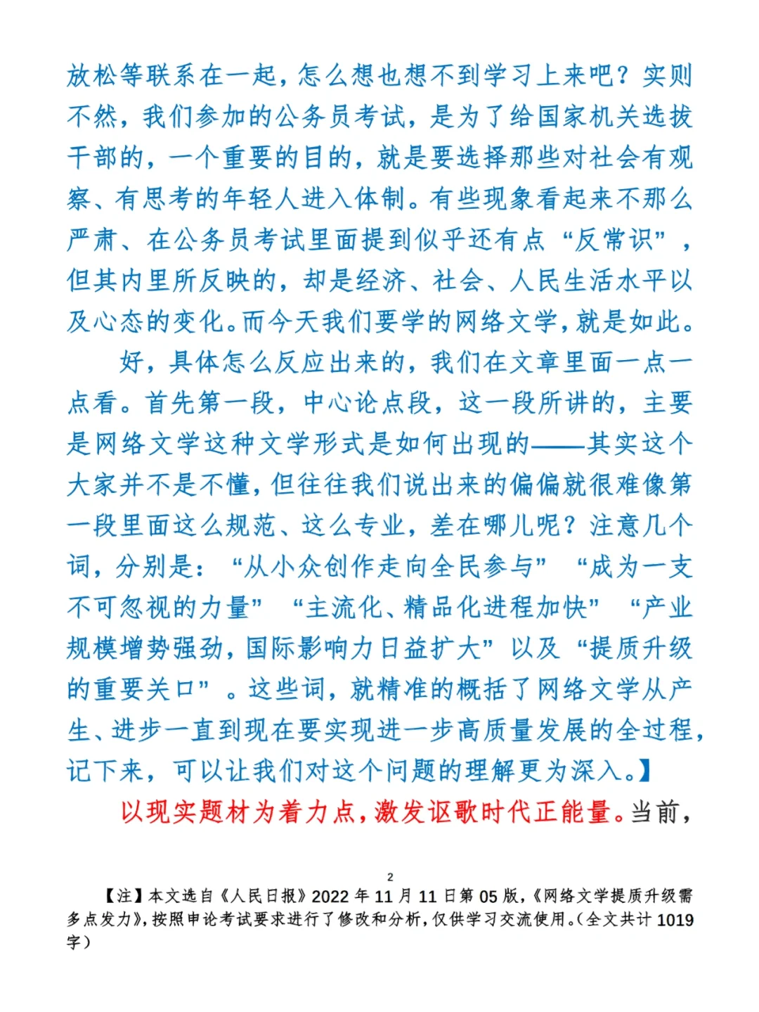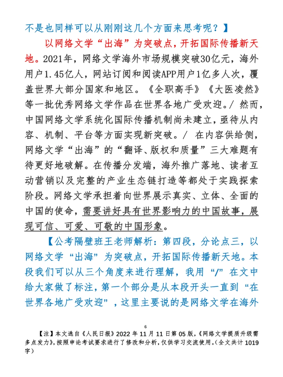 今日打卡作业: 1. 选一句你最喜欢的金句 2. 抄写全文红字+划线部分内容 3. 写完后在留言区打卡 ⭐️ ⭐️ ⭐️ ⭐️ ⭐️ ⭐️ 如何抄写:每天的抄写文章以图片形式发在“公考隔壁班王老师”账号,红色字是重点句和结构句,黑色字是正文,蓝色字是解析,大家抄写时不必抄蓝色字。建议先通读全文(包括蓝色解析部分),做到心中有数再开始抄写,效果会更好。 关于文章:抄写文章来源于人民日报,但每篇文章我都根据申论考试要求进行了修改,主要集中在四个方面:一是重写或修改开头、结尾;二是统一段首句句式结构;三是调整段落字数,使文章结构更均衡;四是简化复杂长难句,使之更具可模仿性。每篇文章修改幅度不同,无论修改多少,都是基于申论考试要求,毫无对人民日报文章品评之意。(此处致敬人民日报) 关于解析:我会在文章每段后面加一段蓝色字的解析,是我自己在抄写时的感悟,篇幅时间有限,不能面面俱到,但求重点突出。如果你有其他感悟,也希望能在评论里分享,我们相互学习、共同进步。 ⭐️ ⭐️ ⭐️ ⭐️ ⭐️ ⭐️ 这里是公考隔壁班王老师独创的“每天半小时・申论80分”抄写团,欢迎加入我们!