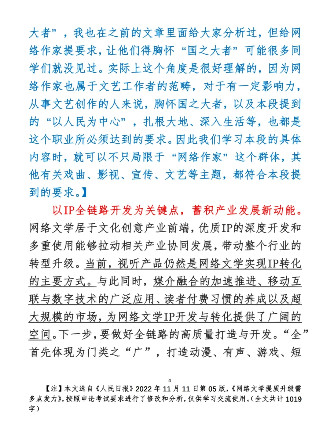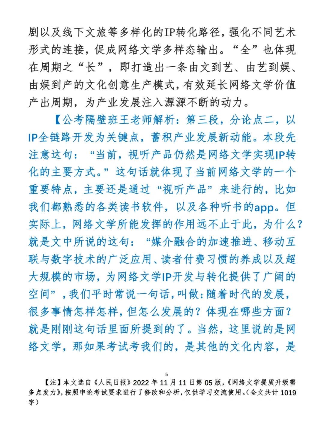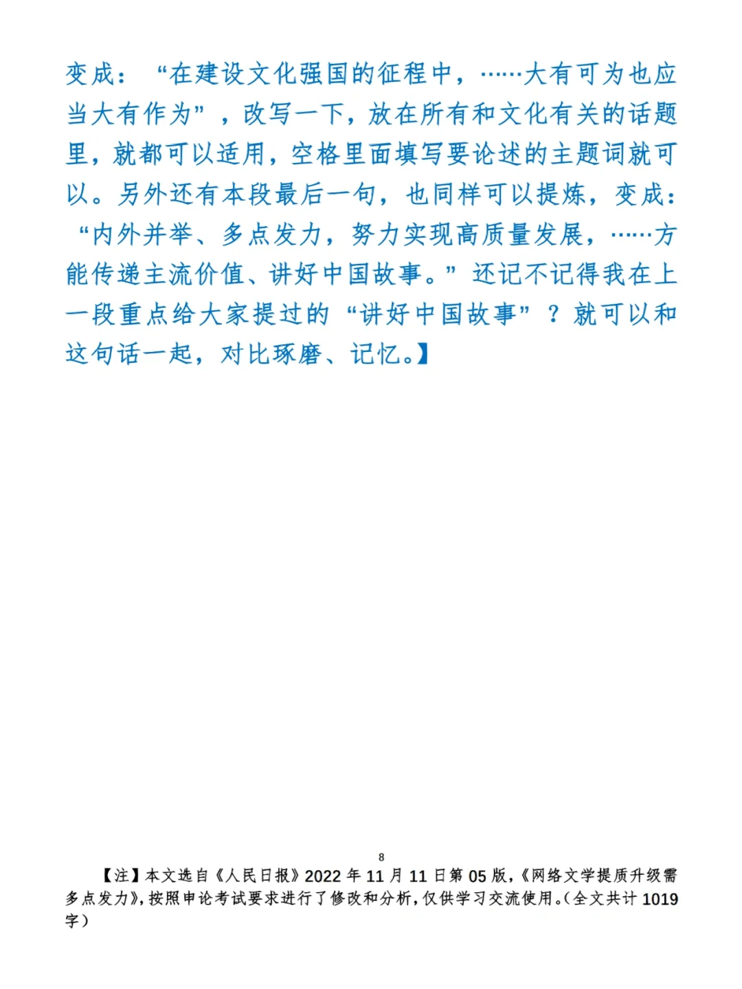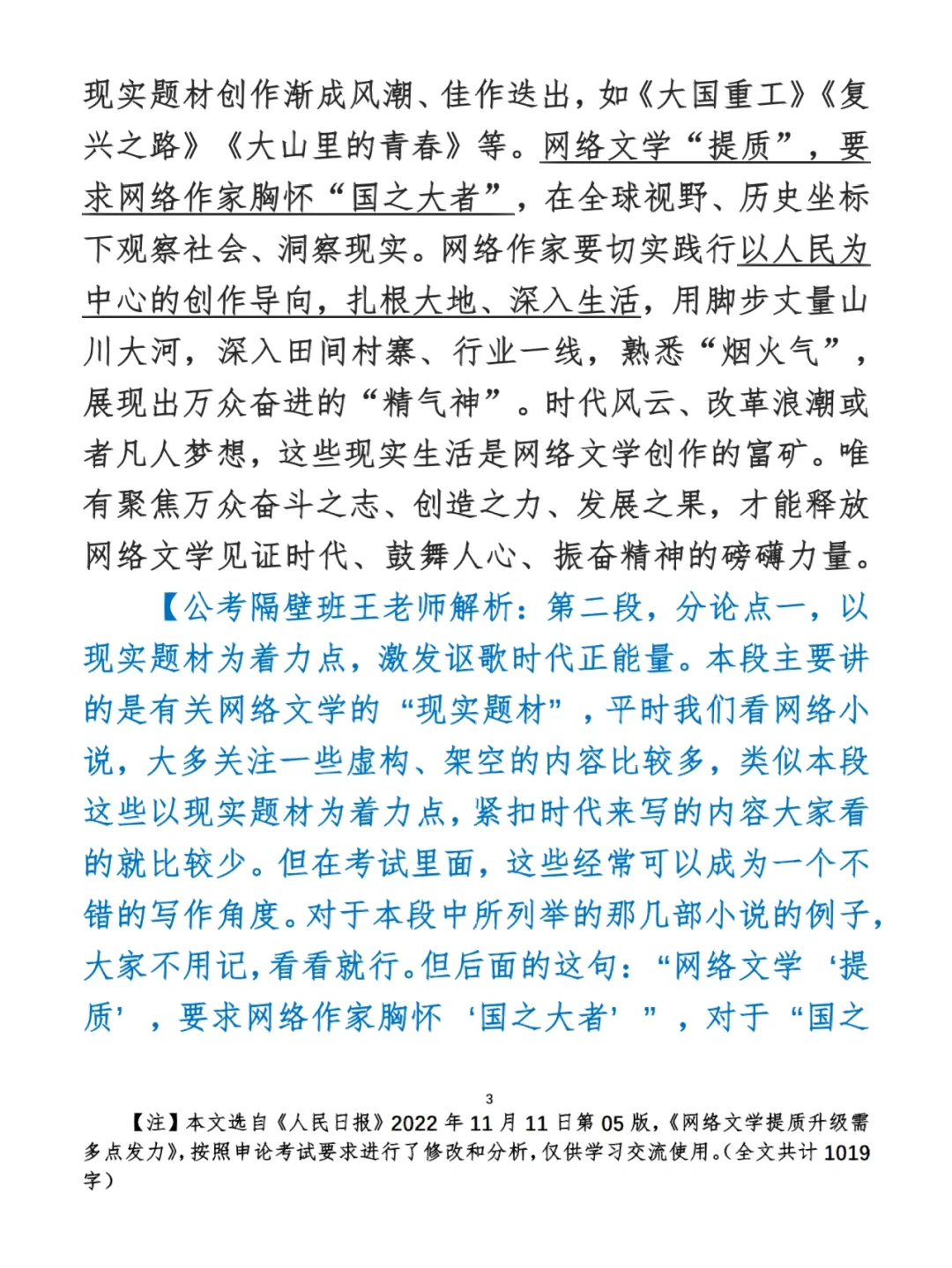 今日打卡作业: 1. 选一句你最喜欢的金句 2. 抄写全文红字+划线部分内容 3. 写完后在留言区打卡 ⭐️ ⭐️ ⭐️ ⭐️ ⭐️ ⭐️ 如何抄写:每天的抄写文章以图片形式发在“公考隔壁班王老师”账号,红色字是重点句和结构句,黑色字是正文,蓝色字是解析,大家抄写时不必抄蓝色字。建议先通读全文(包括蓝色解析部分),做到心中有数再开始抄写,效果会更好。 关于文章:抄写文章来源于人民日报,但每篇文章我都根据申论考试要求进行了修改,主要集中在四个方面:一是重写或修改开头、结尾;二是统一段首句句式结构;三是调整段落字数,使文章结构更均衡;四是简化复杂长难句,使之更具可模仿性。每篇文章修改幅度不同,无论修改多少,都是基于申论考试要求,毫无对人民日报文章品评之意。(此处致敬人民日报) 关于解析:我会在文章每段后面加一段蓝色字的解析,是我自己在抄写时的感悟,篇幅时间有限,不能面面俱到,但求重点突出。如果你有其他感悟,也希望能在评论里分享,我们相互学习、共同进步。 ⭐️ ⭐️ ⭐️ ⭐️ ⭐️ ⭐️ 这里是公考隔壁班王老师独创的“每天半小时・申论80分”抄写团,欢迎加入我们!