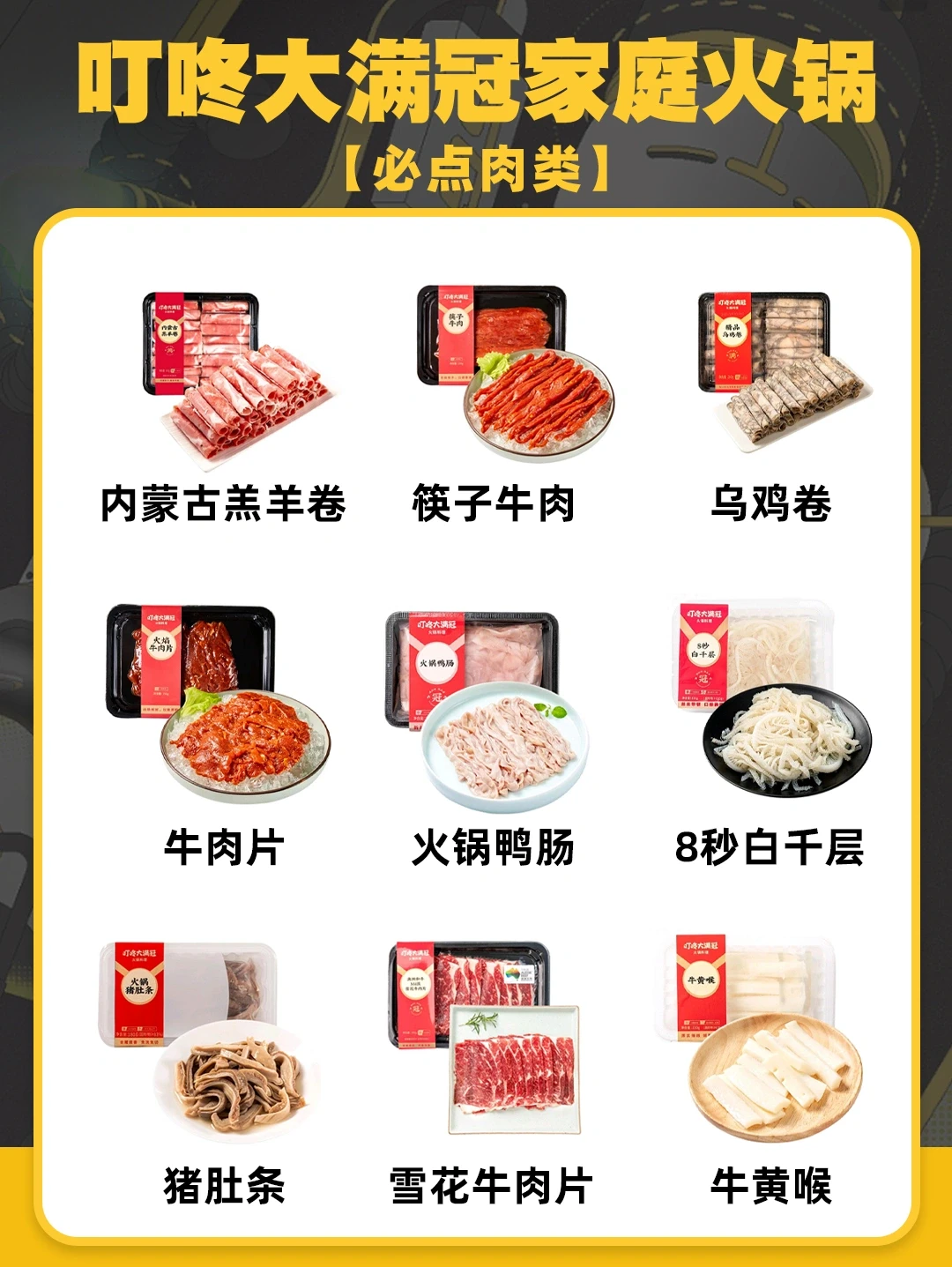 家人们,瞧瞧我发现什么啦? 不用出门也可以吃上火锅啦,在家看着综艺吃着火锅聊着天,这个冬天是真的会爱! 当我发现叮咚也可以火锅送到家,立马下单火锅,直接约朋友来家里吃,真的爽! 直接给大家列好表了,直接按上面点就行啦,真的方便。 ✅经典火锅+必点肉类+豆制品+个人最爱 ✅火锅锅底选择 ✅涮菜时间(强烈推荐8秒系列) ✅蘸料调制 - 叮咚大满冠 冠