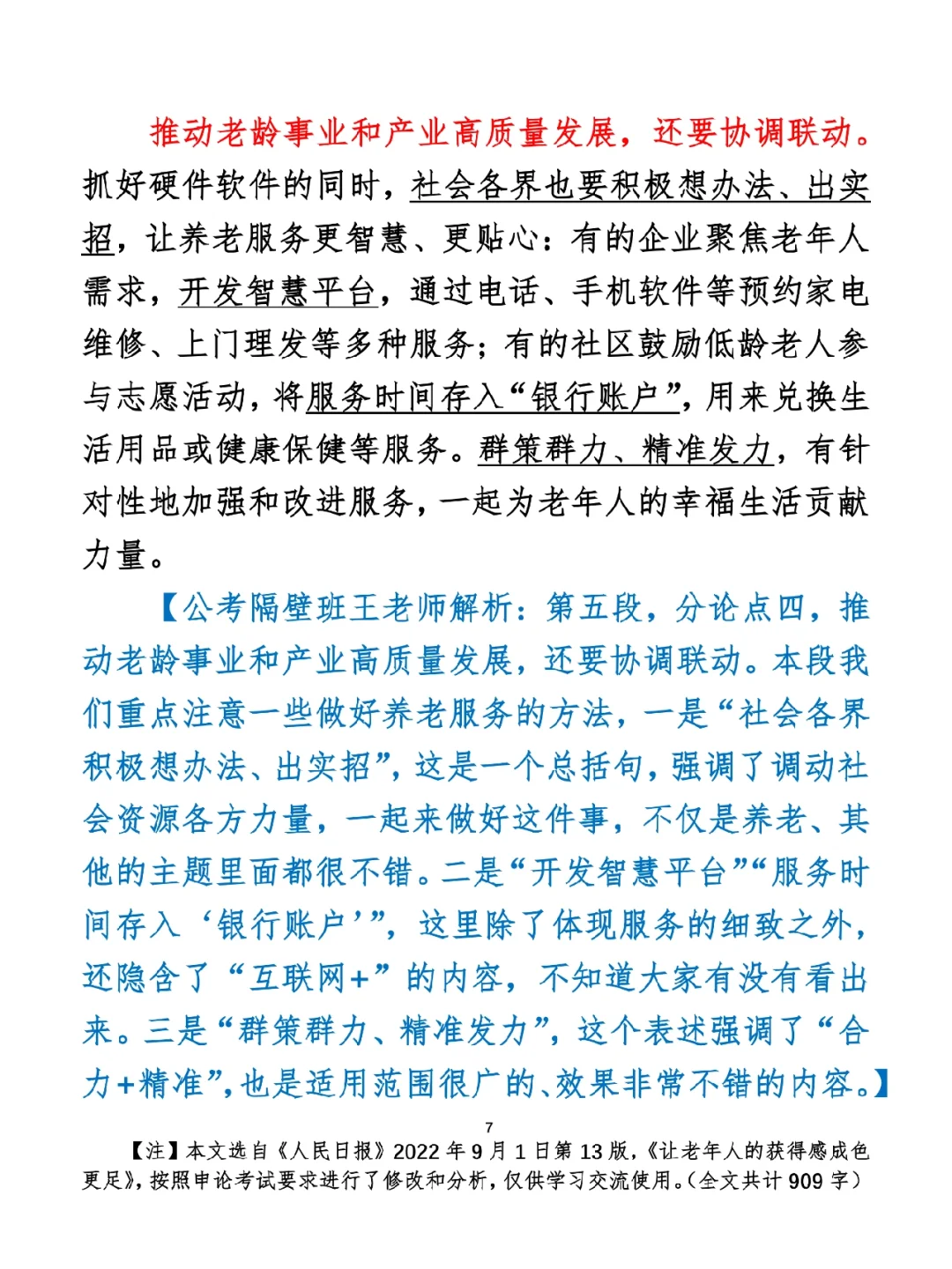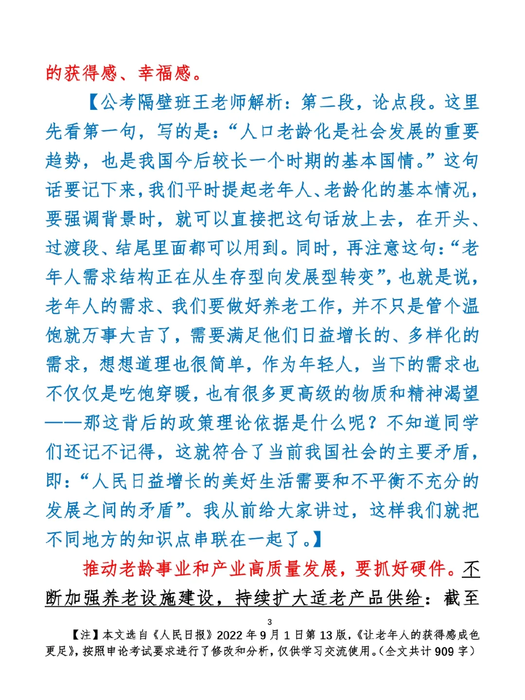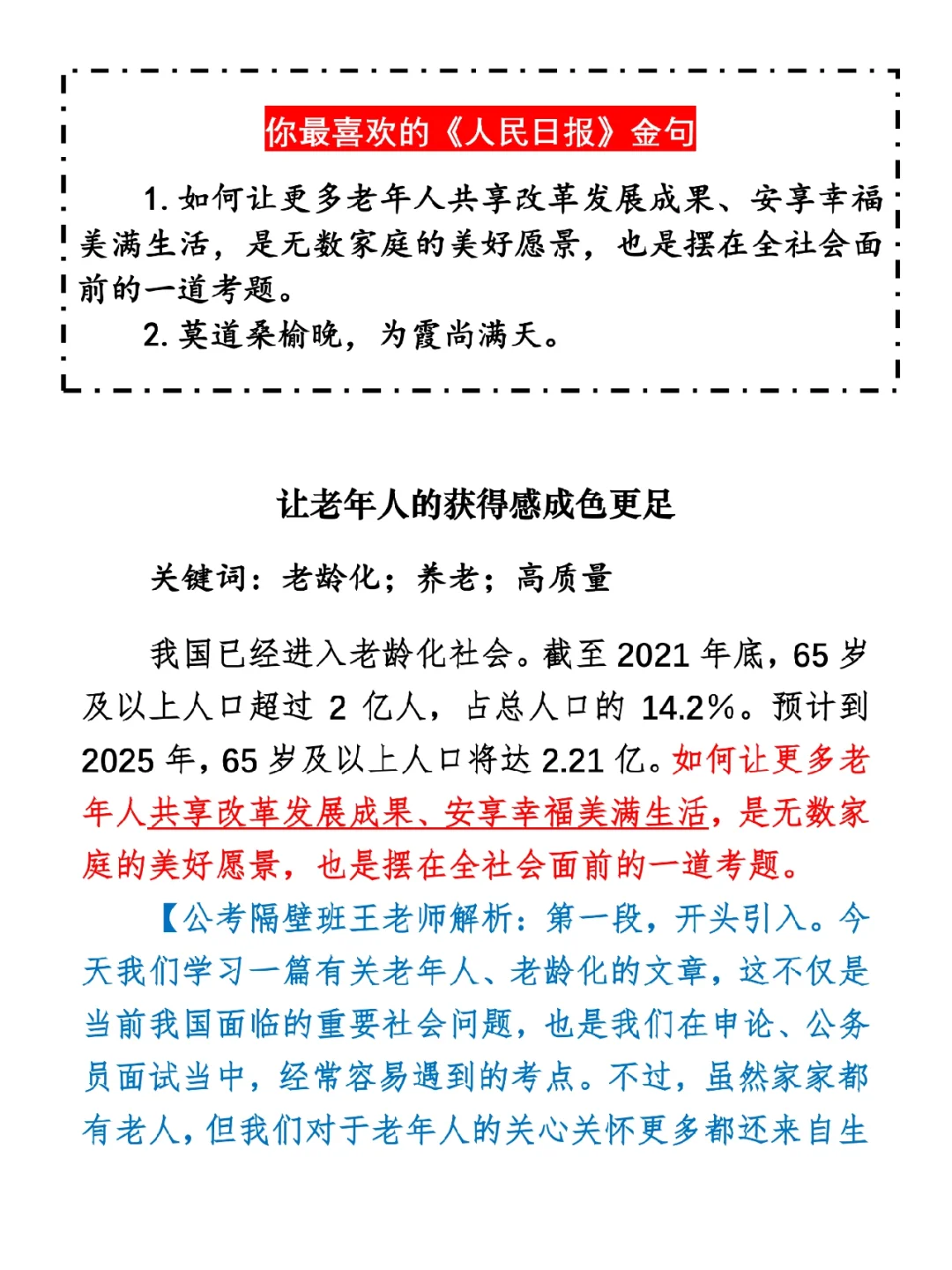 今日打卡作业: 1. 选一句你最喜欢的金句 2. 抄写全文红字+划线部分内容 3. 写完后在留言区打卡 ⭐️ ⭐️ ⭐️ ⭐️ ⭐️ ⭐️ 如何抄写:每天的抄写文章以图片形式发在“公考隔壁班王老师”账号,红色字是重点句和结构句,黑色字是正文,蓝色字是解析,大家抄写时不必抄蓝色字。建议先通读全文(包括蓝色解析部分),做到心中有数再开始抄写,效果会更好。 关于文章:抄写文章来源于人民日报,但每篇文章我都根据申论考试要求进行了修改,主要集中在四个方面:一是重写或修改开头、结尾;二是统一段首句句式结构;三是调整段落字数,使文章结构更均衡;四是简化复杂长难句,使之更具可模仿性。每篇文章修改幅度不同,无论修改多少,都是基于申论考试要求,毫无对人民日报文章品评之意。(此处致敬人民日报) 关于解析:我会在文章每段后面加一段蓝色字的解析,是我自己在抄写时的感悟,篇幅时间有限,不能面面俱到,但求重点突出。如果你有其他感悟,也希望能在评论里分享,我们相互学习、共同进步。 ⭐️ ⭐️ ⭐️ ⭐️ ⭐️ ⭐️ 这里是公考隔壁班王老师独创的“每天半小时・申论80分”抄写团,欢迎加入我们!