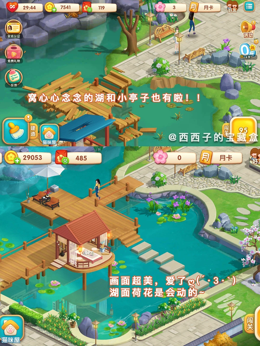 这个游戏的地图很大,💐可以考虑在后花园挖块湖,建个小亭子,让入住我民宿的客人们,🌝夜晚可以到湖上凉亭赏月吹风~…🙌想想就很激动开森(*^▽^*)